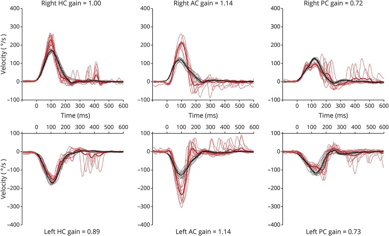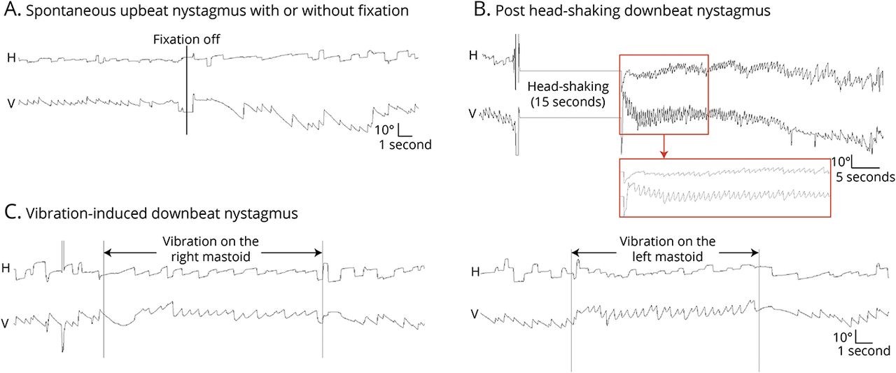 一个47岁的女人与宫颈癌与腹膜转移和抗体阳性血清anti-Ri患有眩晕和不平衡几个月。在考试,她警觉而以。眼外评估显示自发乐观眼球震颤减少慢相速度要么有或没有视觉固定(视频1图1一个)。乐观的眼球震颤在横向和向上凝视降低,增加在向下凝视。乐观的眼球震颤变成悲观的眼球震颤收敛(视频2)期间,摇头水平约15秒钟后(视频3图1 b),并在振动刺激(100赫兹)的额头,乳突和胸锁乳突肌(SCM、视频4图1 c)。悲观vibration-induced眼球震颤(VIN)不是由视觉抑制固定。引起的阵发性悲观的眼球震颤也躺着,直挂,和两侧Dix-Hallpike机动而背地的眼球震颤唤起了头向两侧,仰卧位。额外的发现包括受损的光滑双边和向上,追求过律的水平对准目标,和躯干的运动失调。视频头脉冲测试(点击),vestibulo-ocular反射的收益(伏尔)正常水平半规管两边但增加前运河和减少后的运河(图2)。水平头冲动也产生cross-coupled反应:向上向下偏转的眼睛和纠正跳阅(视频5)。没有证据表明眼部异常反应或倾斜的倾斜的主观视觉垂直。脑部核磁共振是正常的。眩晕、共济失调没有回应皮质类固醇脉搏,静脉注射免疫球蛋白和其他药物包括巴氯芬和加巴喷丁。