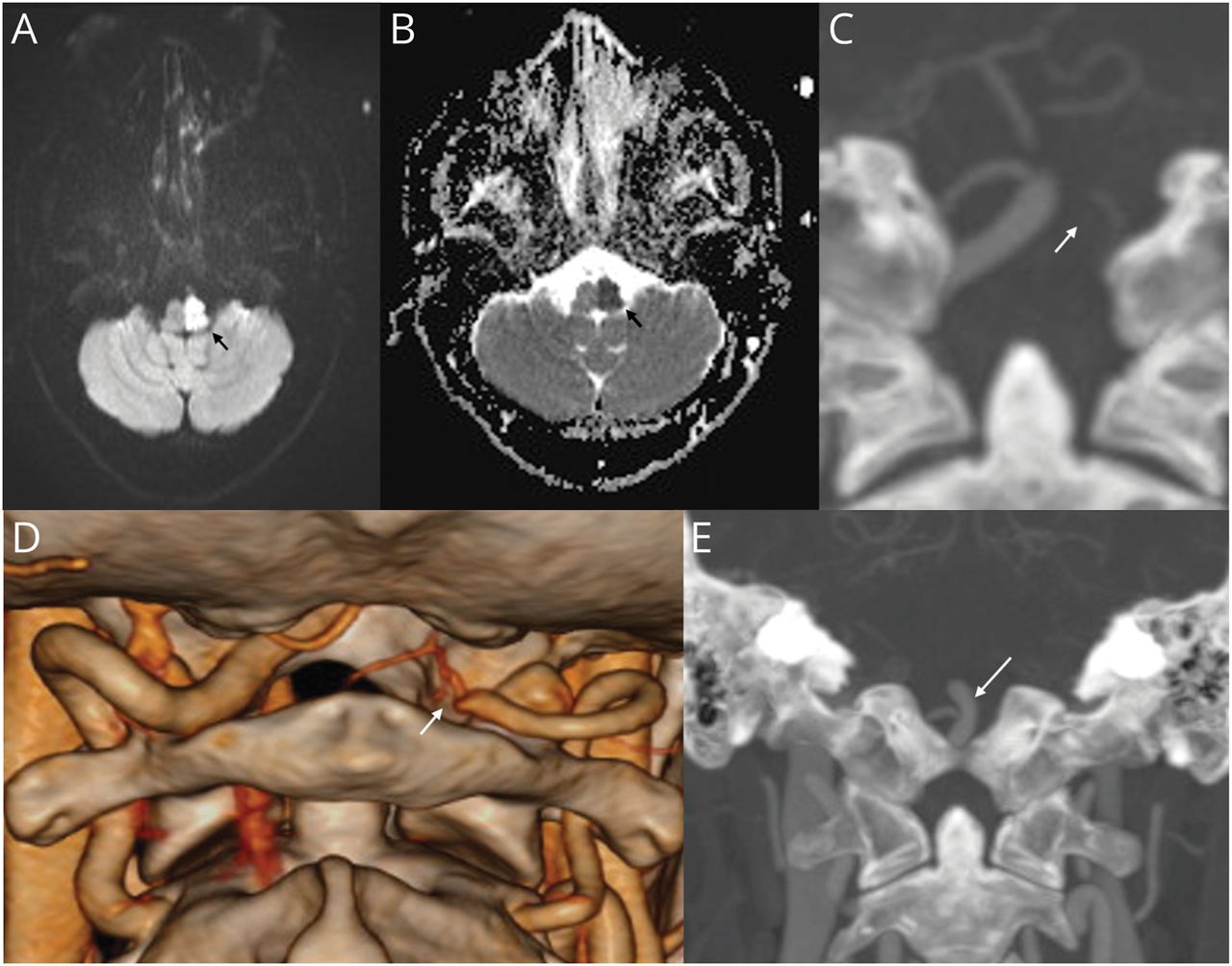 脑非对比MRI显示扩散加权成像显示高信号累及左半脑(A;黑色箭头),在表观扩散系数序列(B;黑色箭头),提示急性梗死。冠状位CT脑血管造影显示左椎动脉V4段未显示(C;白色箭头)和完整的基底动脉远端血流(E;白色箭头)。三维阴影表面显示体绘制(SS-VRT)重建图像显示左椎动脉V4段突然闭塞(D;白色箭头)。