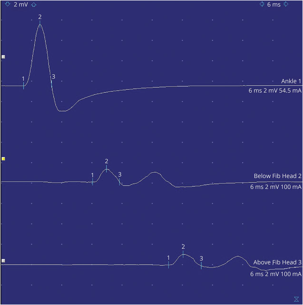 ncs的感觉神经动作电位绝对值正常,但2条神经的振幅不对称(腓肠:右侧11.6uV和左侧21.5uV;中位数:右侧18.4uV,左侧41.0uV)。复合肌肉动作电位(CMAPs)可减慢多根神经的传导速度,部分神经还伴有传导阻滞。腓骨-指短伸肌CMAP在传导阻滞时传导速度特别慢(数字).左侧正中骨和胫骨f波潜伏期延长。电诊断研究的针肌电图部分正常。
