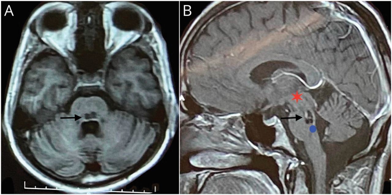(A) t1加权轴向MRI序列显示脑桥背侧低信号病变(黑色箭头标记)。(B) T1W+C矢状面MRI序列显示脑桥后背交界处病变(黑色箭头标记),对比增强微弱。红星代表riMLF,其中有垂直跃动的兴奋性爆发神经元,桥背的蓝色圆圈接近中线外展核水平中缝间核的全顶细胞位置。rimf和全顶神经元之间的连接被破坏,导致反向跳动。riMLF =内侧纵束吻侧间质核。