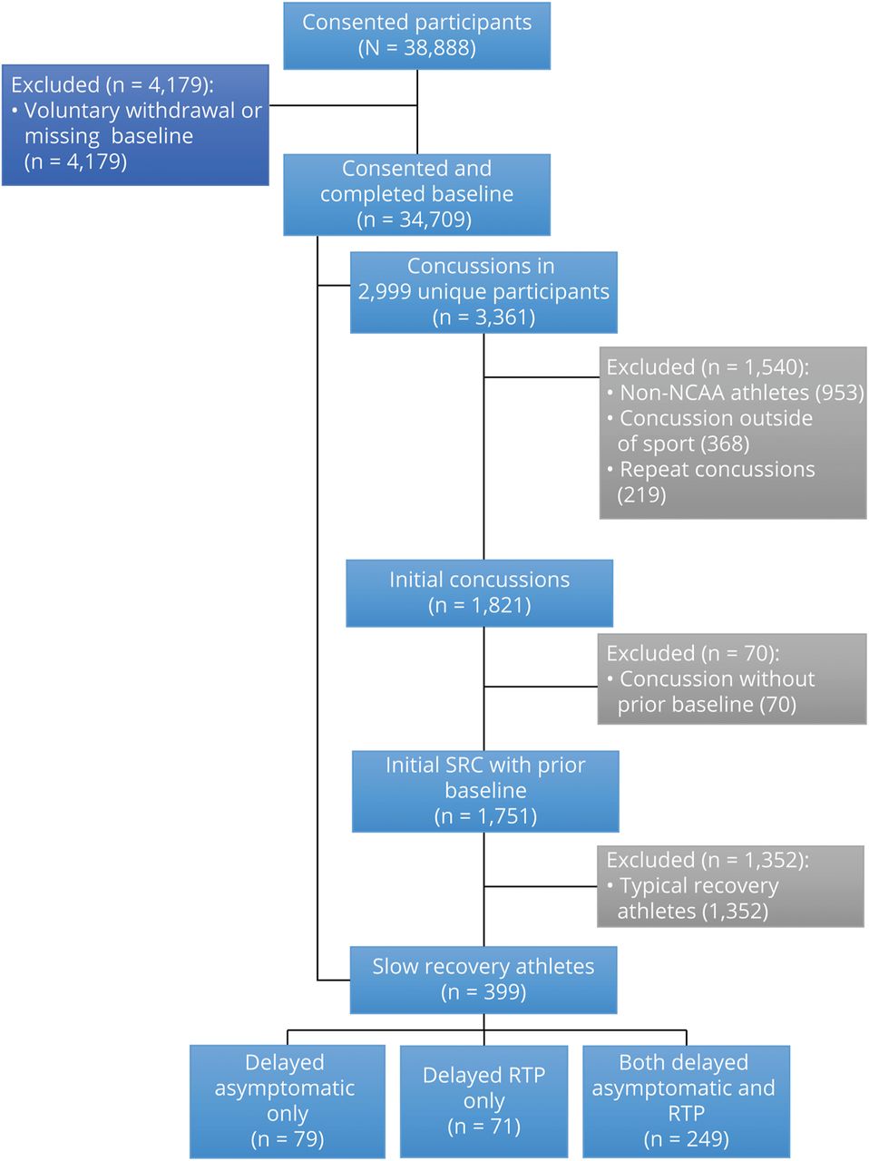 所有大学运动员26平民大学和大学运动代表队的运动员和学员从4军事服务学院在美国都有资格参加。2014年秋季和2018年春季之间,总共有34709名运动员和学员参加保健财团和完成至少1基线评估。3361年登记和摄入量,脑震荡后记录。一个以前的报告22使用这个队列描述自然历史脑震荡的复苏包括中值时间从伤病开始渐进式锻炼和RTP。