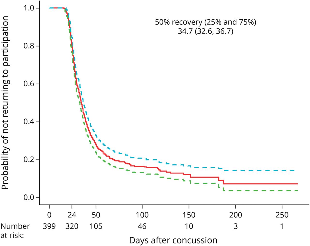 然而,我们的数据表明,一个缓慢的复苏轨迹确实隐含着运动员和他们的医疗提供者。正如已经提到的一段时间,少数有脑震荡的运动员和个人与其他类型的慢性症状模式和轻度创伤性脑损伤可以开发一个更难以完全恢复。正如图2,RTP postinjury减少约60天,那些无法RTP大约在3个月(90天,n = 50)受伤之后,RTP中值为187.1天。总的来说,这些发现表明,虽然总体缓慢复苏组的预后相当不错,恢复期需要的时间越长,成功的RTP的概率曲线趋于平缓,预后变得有利。