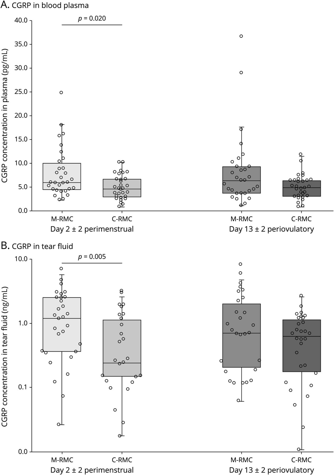 月经期间,CGRP怎样浓度在等离子体和流体在统计学上显著高于与偏头痛发作的参与者相比,女性参与者没有偏头痛(等离子体:5.95 pg / mL (IQR 4.37 -10.44 pg / mL) vs 4.61 pg / mL (IQR 2.83 -6.92 pg / mL),p= 0.020;眼泪流体:1.20 ng / mL (IQR 0.36 - -2.52 ng / mL) vs 0.4 ng / mL (IQR 0.14 - -1.22 ng / mL),p= 0.005)(图1)。