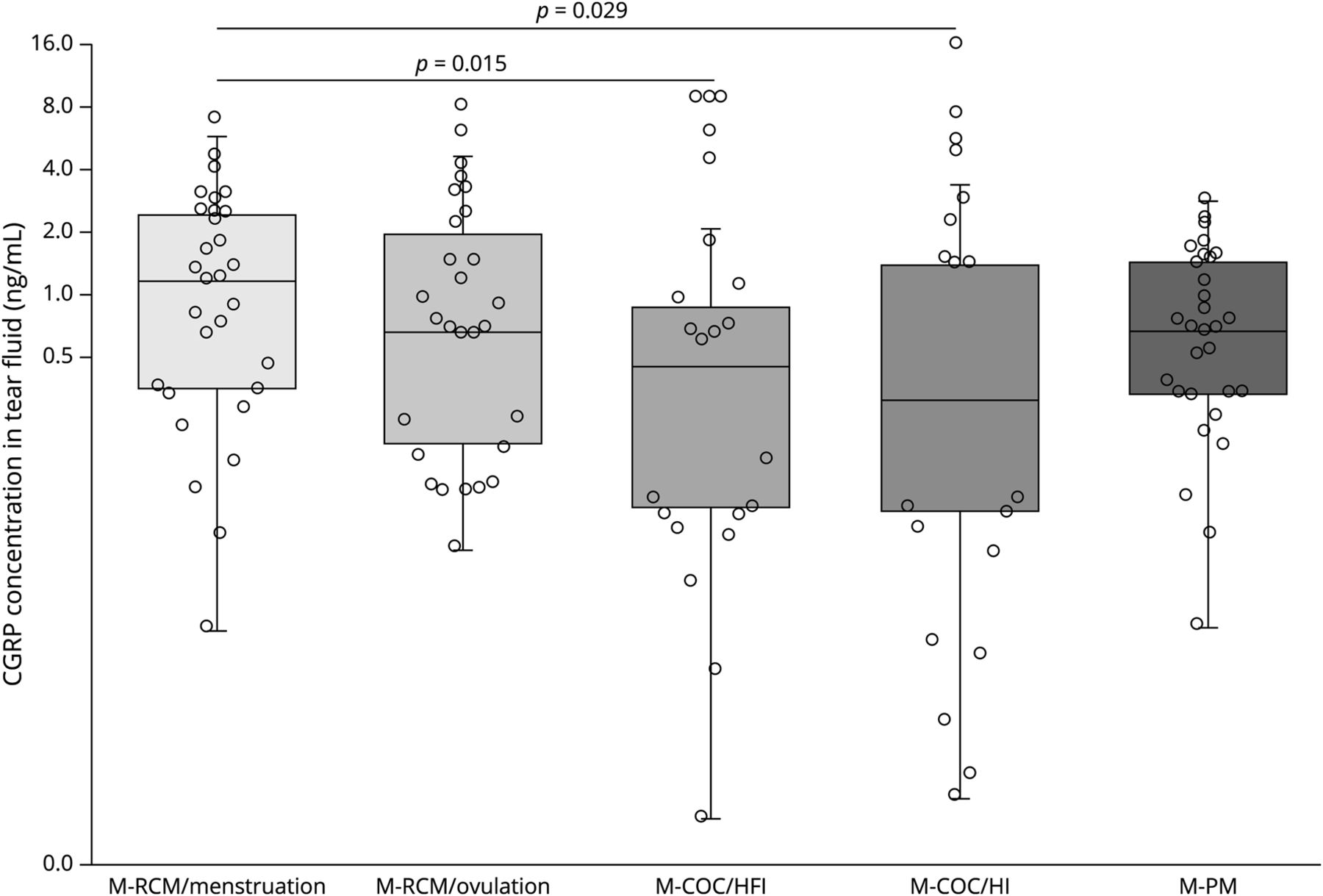 在所有参与者与偏头痛,CGRP怎样等离子体浓度相似在所有组织和访问(p在所有组)= 0.195。撕裂的流体,女性参与者RMC CGRP怎样浓度显著高于月经期间相比,女性参与者在COC (p= 0.015 vs高频感应p= 0.029 vs嗨)(图2)。没有绝对的雌激素和孕激素浓度之间的相关性和血浆CGRP怎样浓度和撕裂液(p> 0.17分析)。