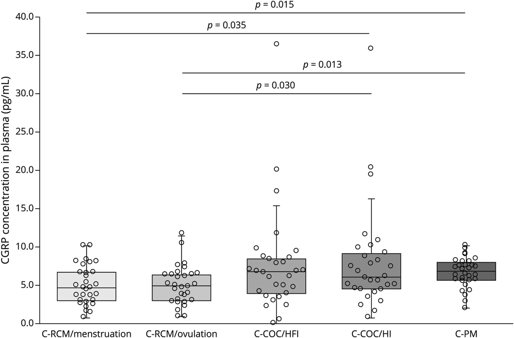 方法参与者的RMC 2访问:月经期间月经周期一天2±2和periovulatory 13±2天。参与者在COC检查无激素的4±2天时间间隔(高频感应)和7天至14激素摄入(你好)。绝经后参与者评估在一个随机时间点。等离子体和流体样本收集每一次访问太阳系时,以ELISA CGRP怎样水平的测定。