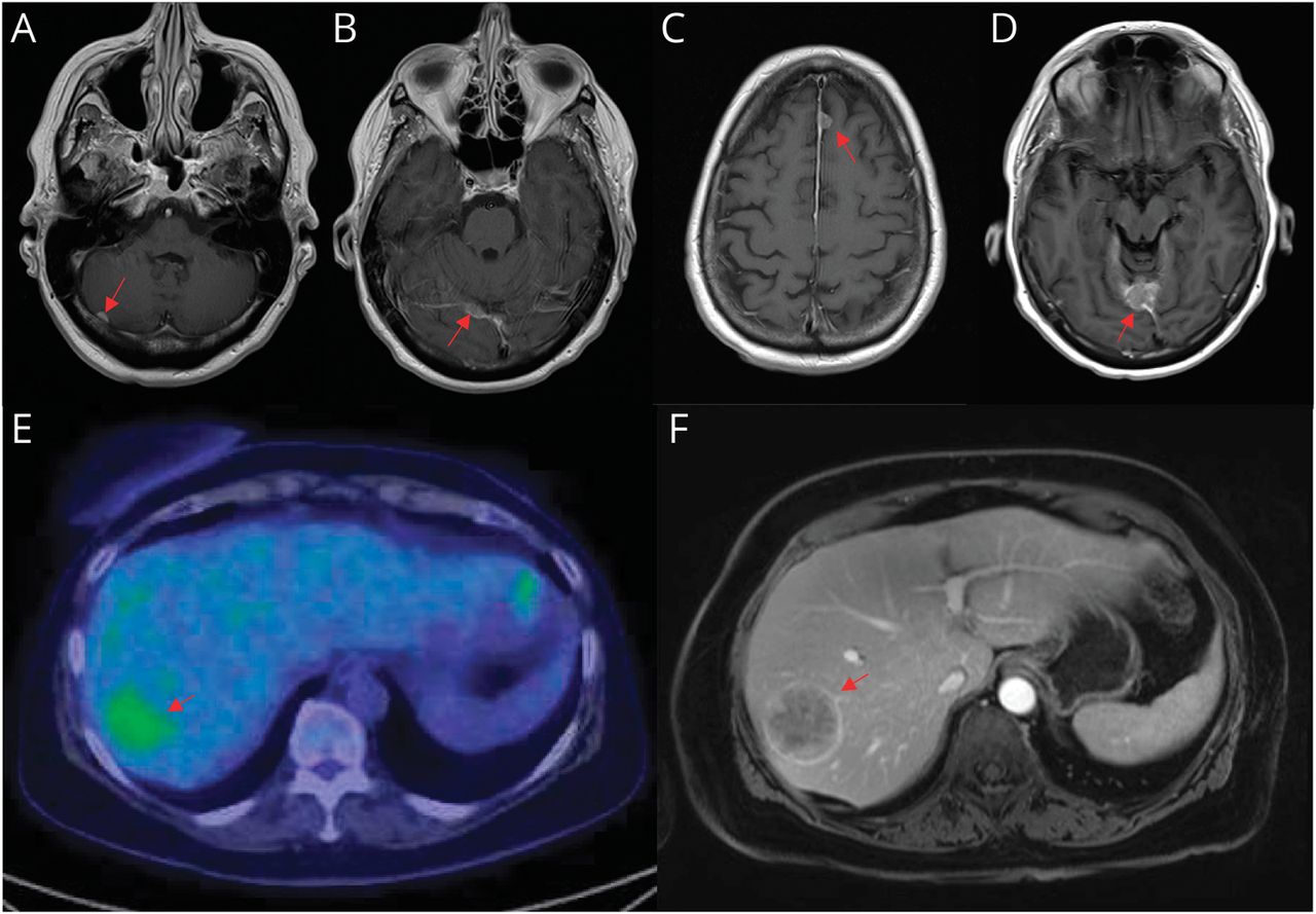 Postcontrast t1加权磁共振轴显示小脑病变涉及正确的(A),幕的传单(B),左前镰(C)。(D) Postcontrast t1加权磁共振轴向展示增加对幕的病变的大小。pet - ct机(E)显示病变在上级后肝右叶。(F) MRI显示肝转移。