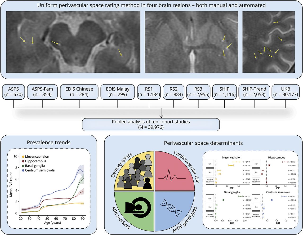 PVS被假设在各种脑部病理反应中扩大。关于PVS决定因素的研究仅限于相对较小的单点调查,并且使用了广泛不同的方法,因此很难从错误和/或有偏见的结果中区分出真实的关联。我们对基于人群的队列研究的多站点分析结果显示了这一点,来自各个站点的不同结果汇聚成一个可靠的PVS决定因素的整体图景。我们发现,年龄的增长与大脑中更多的pv有关,而其他决定因素则是区域特异性的,包括性别、心血管风险因素、APOECSVD的基因型和MRI标记物。我们的研究结果支持pv有多因素起源的观点,并强调了合作努力的力量。