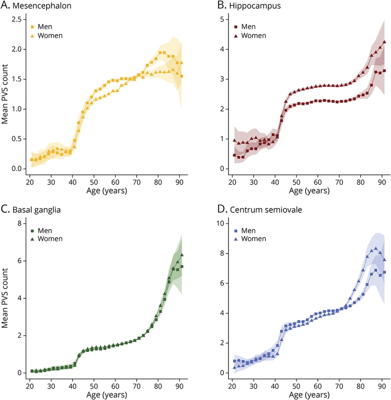 中脑(A)、海马体(B)、基底节区(C)和半叶中央(D)四个脑区一生中PVS的平均计数。男性的平均PVS计数用正方形表示,女性的平均PVS计数用三角形表示。缩写:PVS =血管周围空间。