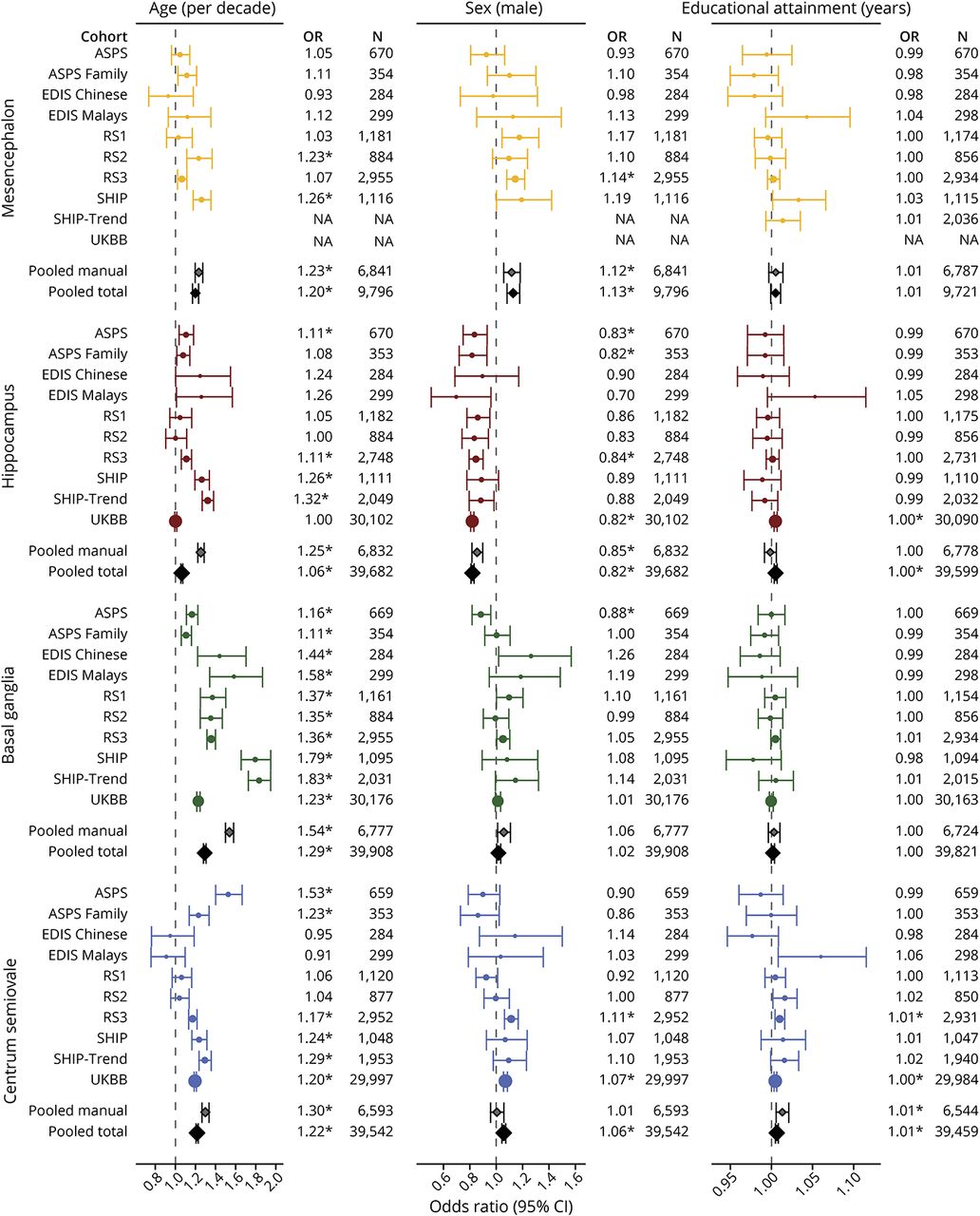 首先,我们调查了与pv计数相关的人口因素。图2显示了4个大脑区域中PVS计数的年龄和性别差异趋势。除了中脑外,大多数区域的PVS计数在手动评分的数据集中都较高(图1;links.lww.com/WNL/C398)。年龄越大,所有区域的PVS都越多,与其他区域相比,基底节区的影响最大(OR / decade [95% CI] = 1.29 [1.28-1.30]) (OR在1.06 - 1.22之间)(表4;links.lww.com/WNL/C400)。男性在中脑(1.13[1.08-1.18])、半谷中心区(1.06[1.04-1.07])和基底节区(1.02[1.00-1.03])的PVS较多,而在海马体(0.82[0.81-0.83])的PVS较少,尤其是在老年时。受教育年限与半椎体(1.01[1.00 - 1.01])和海马(1.00[1.00 - 1.01])更多的PVS相关。具有所有效应估计的森林样地,即每个站点和汇总,显示在图3.
