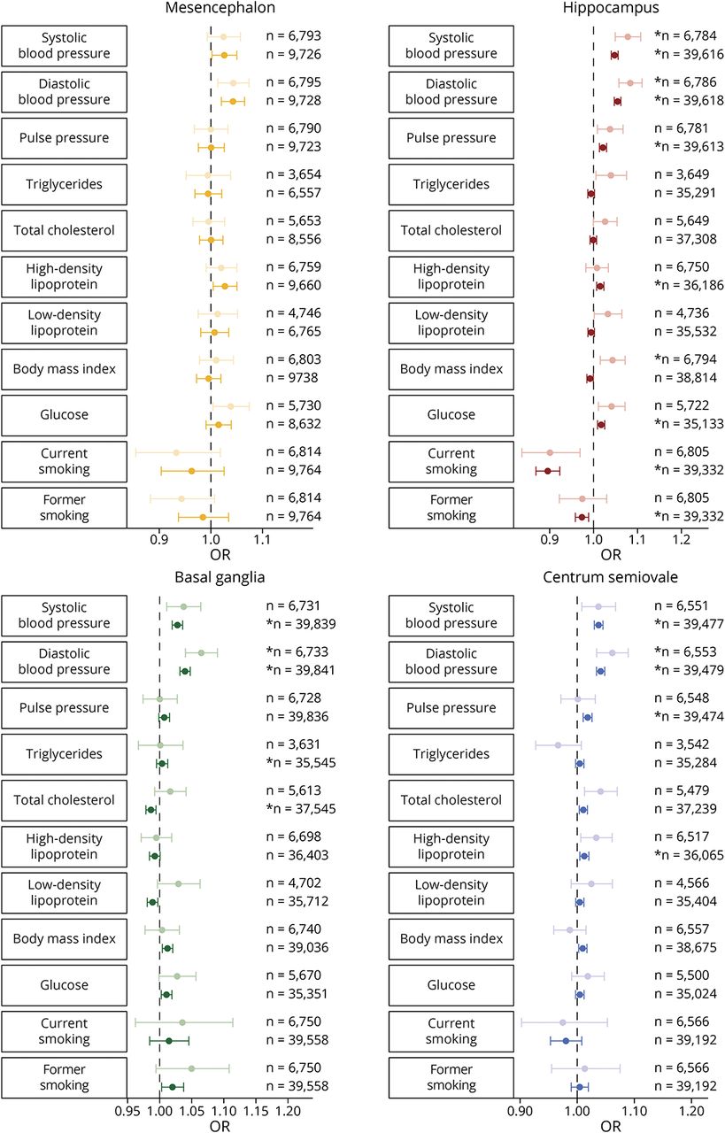 森林图显示了4个脑区心血管危险因素与PVS计数之间的比值比和相应的95%置信区间。较浅的颜色对应于仅包括手动评级的混合分析,较深的颜色对应于包括手动和自动评级的混合分析。*通过多次测试修正(p< 0.05/19).缩写:PVS =血管周围空间。