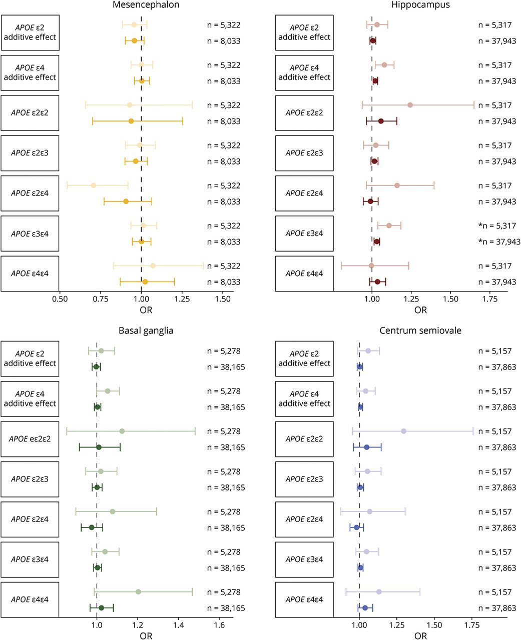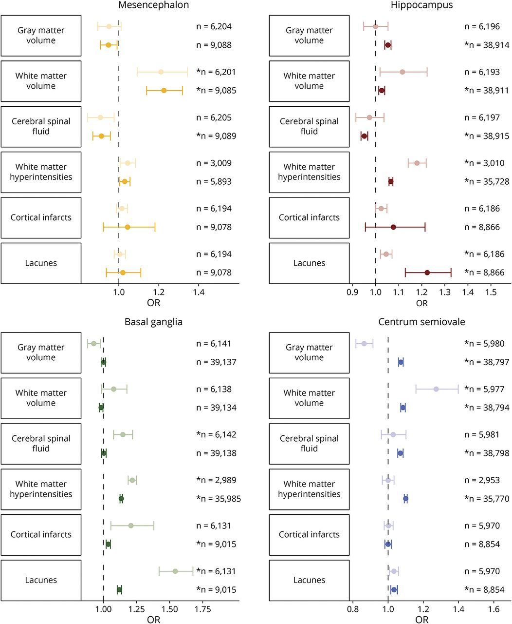 森林图显示MRI标记物与4个脑区PVS计数之间的比值比和相应的95%置信区间。较浅的颜色对应于仅包括手动评级的混合分析,较深的颜色对应于包括手动和自动评级的混合分析。*通过多次检验校正(p < 0.05/19)。PVS =血管周围空间