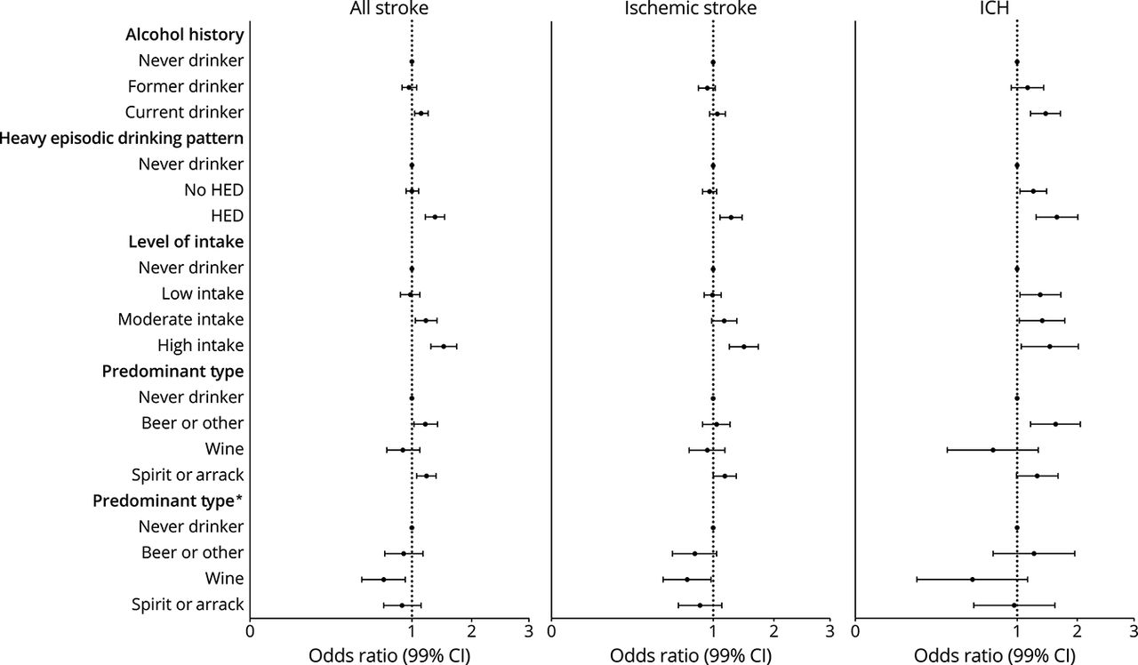 在多变量调整后,当前饮酒与所有中风的几率增加相关(OR 1.14;95% CI 1.04-1.26)和ICH (OR 1.50;95% CI 1.21-1.85),但与缺血性卒中无相关性(OR 1.06;95% ci 0.95-1.19) (图2)(表五,links.lww.com/WNL/C416).以前饮酒和中风之间没有联系。在当前饮酒者中,HED与所有中风相关(OR 1.39;95% CI 1.21-1.59),缺血性卒中(OR 1.29;95% CI 1.10-1.51)和ICH (OR 1.76;95% ci 1.31-2.37)。与从不饮酒者相比,低饮酒者与所有中风或缺血性中风之间没有关联,但增加了ICH的几率(or 1.39, 95% CI 1.04-1.86)。高酒精摄入与所有中风一致相关(OR 1.57;95% CI 1.31-1.89),缺血性卒中(OR 1.55;95% CI 1.26-1.90)和ICH (OR 1.59; 1.06–2.39). Predominant beer or other alcohol was associated with all stroke (OR 1.21; 95% CI 1.03–1.44) and ICH (OR 1.73; 95% CI 1.21–2.46) but not ischemic stroke. Predominant wine consumption was not associated with stroke. Predominant spirit or arrack consumption was associated with increased odds of all stroke (OR 1.23; 95% CI 1.07–1.41) and ischemic stroke (OR 1.18; 95% CI 1.00–1.39) but not ICH. With additional adjustment for HED and level of intake, associations between beer or other alcohol and spirit or arrack consumption and stroke were attenuated, whereas the associations between wine consumption and stroke demonstrated a significantly lower risk for all stroke (OR 0.67; 95% CI 0.49–0.91) and ischemic stroke (OR 0.69; 95% CI 0.49–0.97) but not ICH.