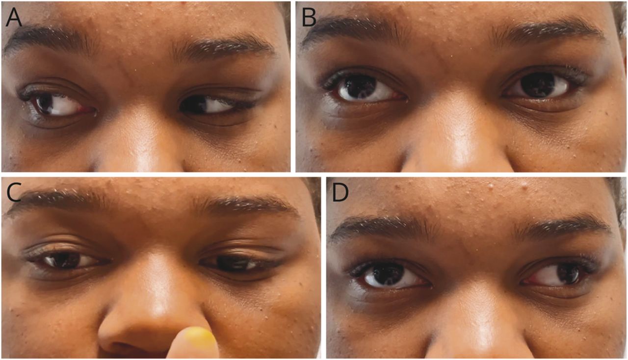 一名有哮喘病史的12岁女孩,表现为急性复视、头晕、眼动异常。她将复视描述为图像并排堆叠。闭上任意一只眼复视消失,向左凝视时复视更严重。她主观上有头晕的感觉,并描述她的眼睛要疯了。她否认头痛、眼动疼痛、虚弱和排便或膀胱症状。既往无疾病或外伤。
