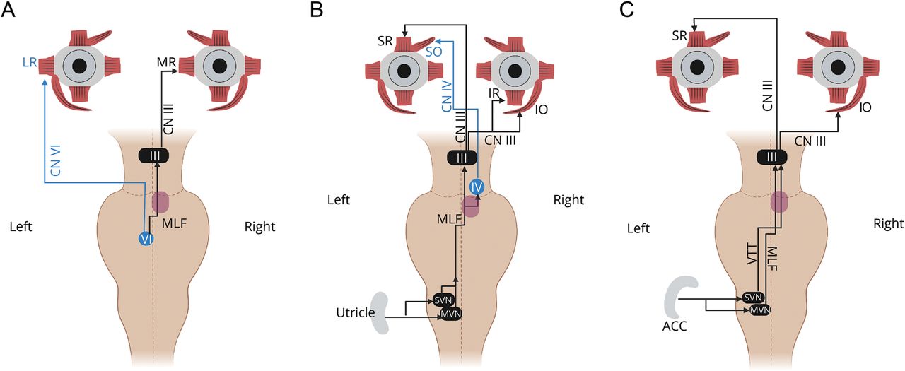 (A)水平左共轭注视脑干通路。(B)头部向左倾斜的耳石通路。(C)前半规管VOR通路。右侧脑桥内侧连接处的粉红色椭圆形阴影区显示病变的位置。在图(A)中,病变影响中颞叶,导致右INO。在(B)中,病变影响MLF,携带来自左侧胞囊的耳石信号,从而产生右眼斜视(偏斜),并向左侧回旋扭转(SR和SO通常会进入左眼;IR和IO通常会使右眼受累)和右扭性眼震(OTR)。在(C)中,病变同时影响MLF和VTT,携带来自ACC的信号,从而产生向下偏倚(通过影响左SR和右IO肌)和正向眼震。ACC =前半规管;CN =脑神经; IO = inferior oblique; IR = inferior rectus; LR = lateral rectus; MLF = medial longitudinal fasciculus; MR = medial rectus; MVN = medial vestibular nucleus; SO = superior oblique; SR = superior rectus; SVN = superior vestibular nucleus; VTT = ventral tegmental tract; III = oculomotor nuclear complex; IV = trochlear nucleus; VI = abducens nucleus. This figure was created withBioRender.com.