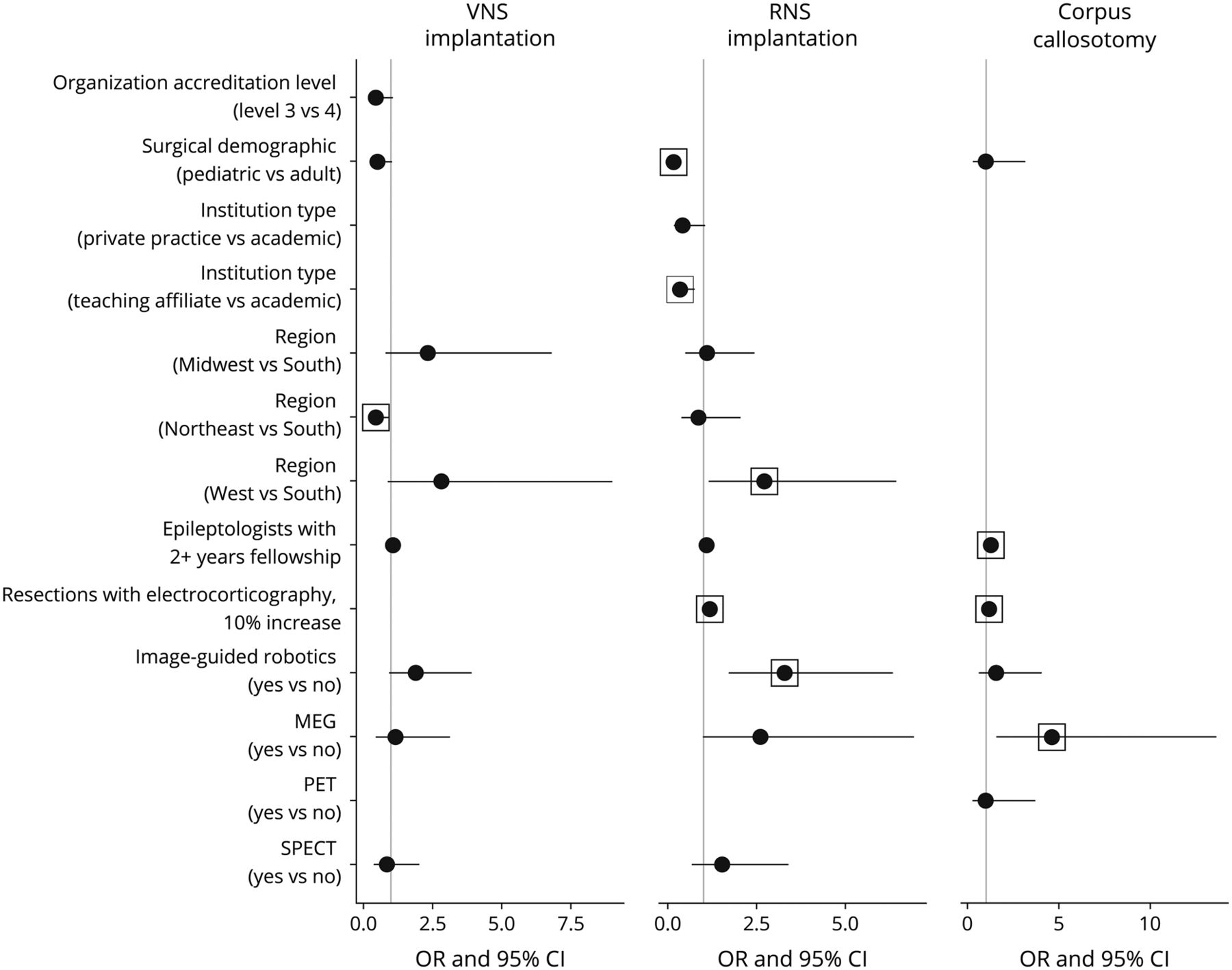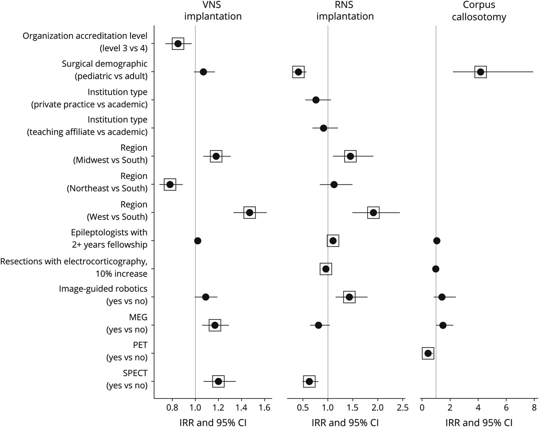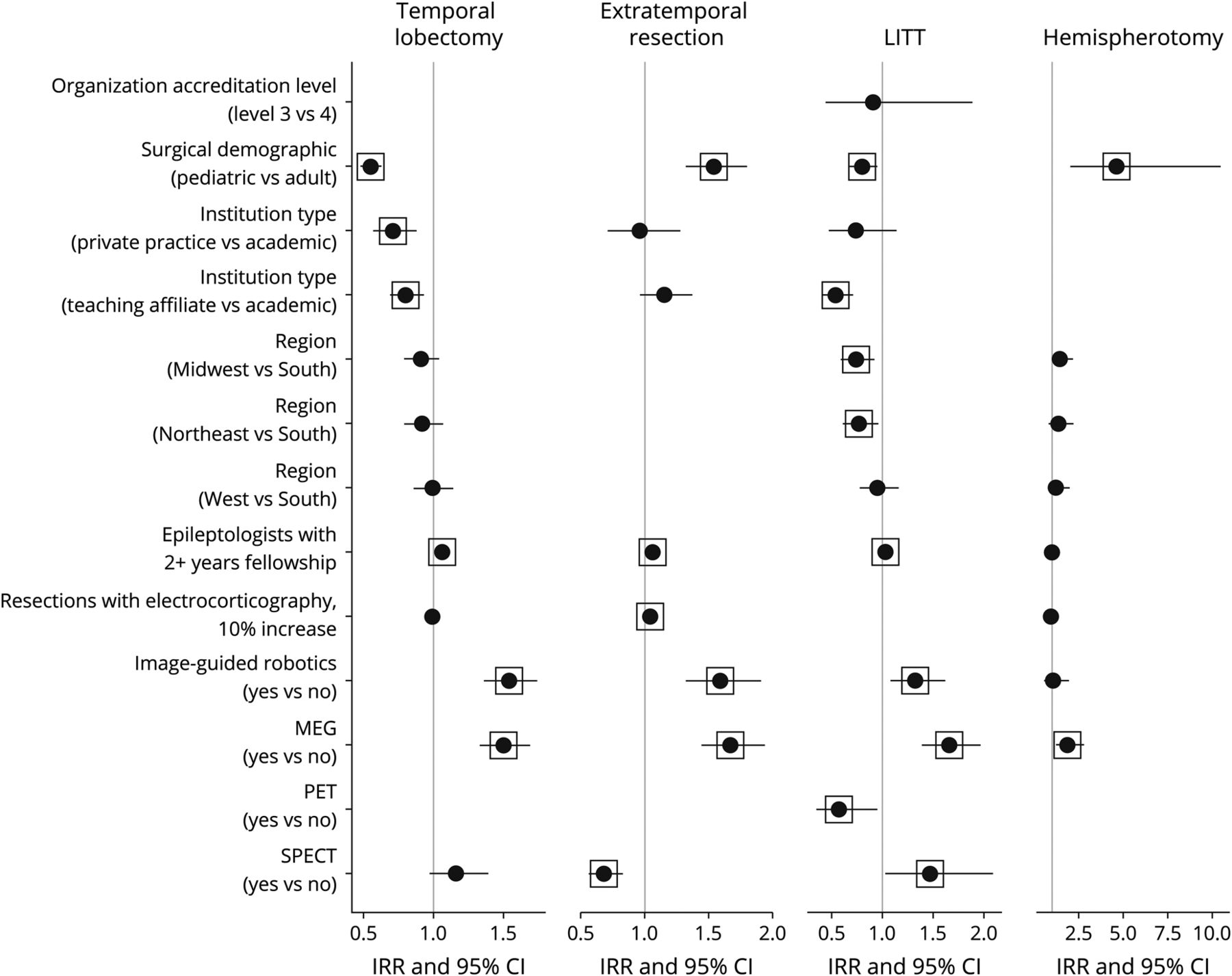 单独的回归模型建立的手术治疗作为因变量,其中包括颞叶切除术,extratemporal切除,hemispherotomy /切除术,LITT,、胼胝体、迷走神经刺激法植入,和响应神经刺激(RNS)植入。脑深部电刺激情况下被排除在外,因为缺乏可靠的报告。潜在模型自变量包括组织认证级别(级别3和4),中心主任人口(儿童和成人患者),机构类型(学术、私人诊所或教学联盟),美国地理区域(南部、中西部、东北、西部),2年或以上的epileptologists奖学金培训、百分比与electrocorticography切除术(ECOG;通过增量增长10%),图像引导机器人(yes和no)的可用性,可用性的脑磁图描记术(梅格;是和否)、可用性的正电子发射断层扫描(PET);yes和no),和可用性的单光子发射计算机断层扫描(SPECT);是和否)。变量是高度不平衡是不习惯在多变量模型中,这通常被组织认可的分布处理水平。