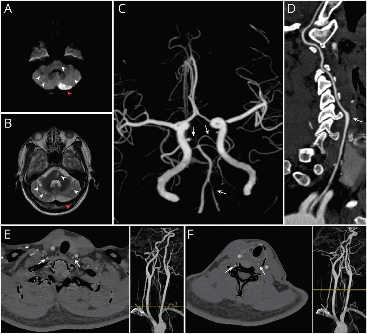 • Brain MRI and CT Angiographies of the Patient Diffusion-weighted imaging showing diffusion restriction in the left cerebellar hemisphere suggestive of acute infarction (A, red arrowhead). T2-weighted image showing multiple areas of hyperintensity in the bilateral cerebellar hemispheres and pons suggestive of chronic ischemic changes (B, white arrowheads). Head CTA revealing a patent but hypoplastic left VA (C, leftward arrow) and dominant right VA in comparison. Note the stenosis in the P1 segment of the right posterior cerebral artery and in P1 and P2 segments of the left posterior cerebral artery (C, downward arrows). Neck CTA showing that the left VA aberrantly originates from the aortic arch between left carotid artery and left subclavian artery and dilates at the C5 cervical level (D, white arrow) then enters the C4 transverse foramen, rather than the typical C6 level. The axial planes of CTA showing asymmetrical VAs in either V1 segment (E, white arrow) or V2 segment (F, white arrow). Yellow lines in the right panels indicate the corresponding transverse levels.