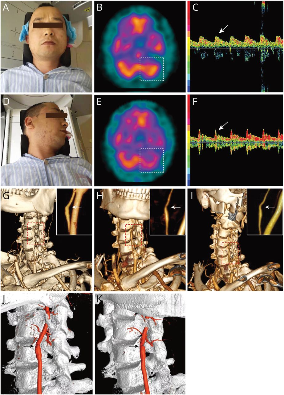 在头部中立位(A), SPECT显示左小脑半球血流充足(B,虚线框);TCD表现为峰钝斜率平缓的正常谱(C,白色箭头),脉动指数(PI)为0.94。当患者把头向左转45°(D)时,左小脑半球血流量减少(E,虚线框);TCD谱峰变尖(F,白色箭头),PI增大到1.64,流动阻力增大。在重建CTA所示的中立头位(G)中,除了C5颈椎水平的血管扩张外,左侧VA没有闭塞。当头部向左旋转至大约45°(H)或90°(I)时,可在C5颈椎横突处沿左VA扩张处看到明显狭窄。在插图中,用红色框起的区域被放大并重建,变窄的部位用白色箭头表示。G和I所示的CTA结果分别在头部中立位置(J,黑色箭头)和头部向左旋转90°(K,黑色箭头)时进行重建DSA确认。