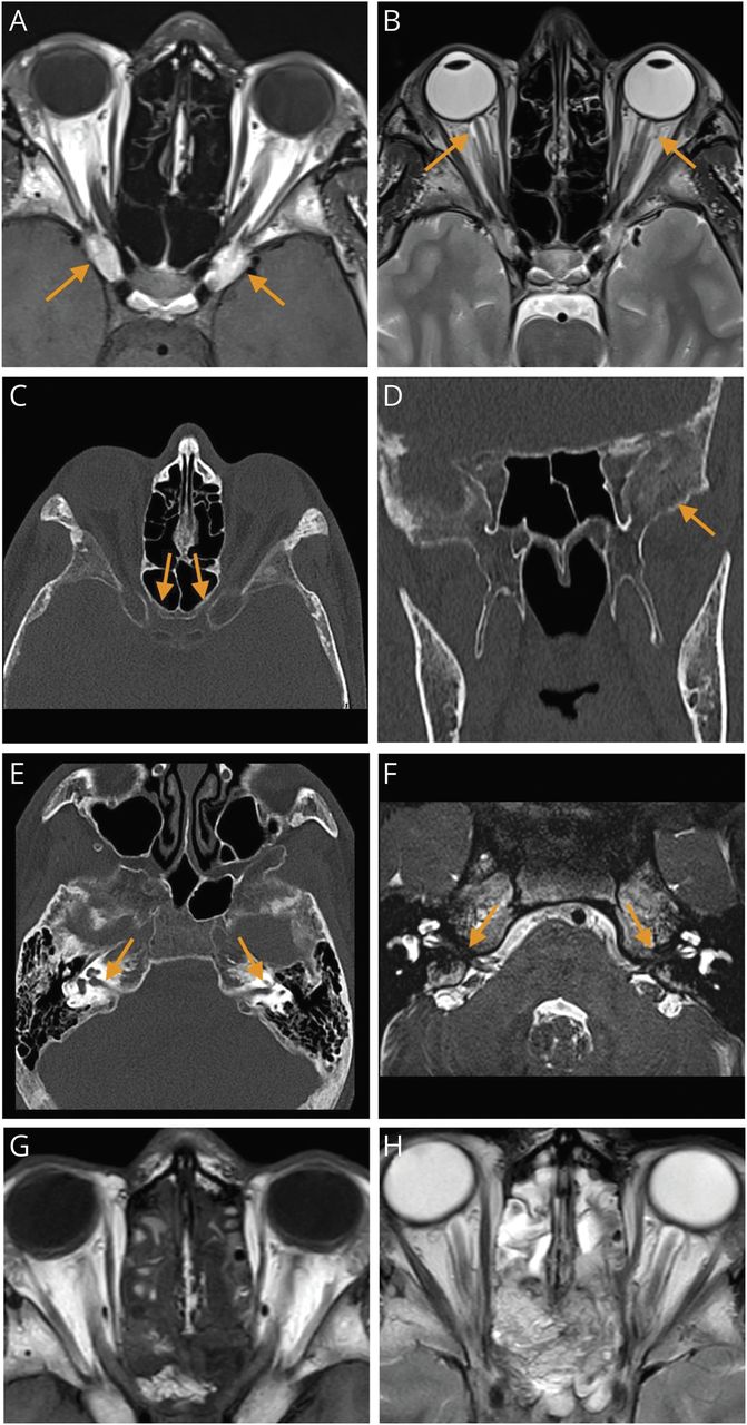 (一)轴向t1加权图像显示前鞍突骨肥大过程与双边视神经管狭窄。(B)轴向t2加权图像显示双边CSF膨胀的视神经鞘拔火罐的视神经头。CSF膨胀只后方延伸视觉运河。(C)轴向CT骨窗显示双边视神经管狭窄。(D)冠状CT重建显示骨骨肥大与“毛玻璃”中央颅底的变化,典型的纤维发育不良。(E)轴向CT扫描显示双边骨骨肥大的坚硬的颞骨内部听觉运河的狭窄。(F)严重核磁共振造影扫描内听道显示双边的第七和第八颅神经的压缩。(G)术后轴t1和t2加权(H)的图像显示双边减压视神经运河持续性脑脊液视神经鞘的膨胀。