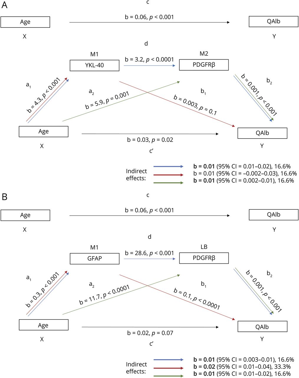 因为年龄、CSF PDGFRβ和CSF标记(YKL-40 GFAP)是反映神经炎症与QAlb (eTable 1,links.lww.com/WNL/C795)和R2模型的组合预测的影响高于对个人的影响(eTable 2),我们进行了顺序统计中介分析来确定神经炎症和周皮细胞损伤影响QAlb和年龄之间的关系。我们观察到,CSF PDGFRβ完全介导的影响YKL-40 QAlb (b= 0.01,β= 0.05,95% CI 0.01 - -0.02,p< 0.05;连续的中介中蓝色箭头所示图4一),因为直接影响YKL-40 QAlb不显著(p> 0.05,红色箭头图4一)。CSF PDGFRβ的间接的中介效应占总效应(16.6%的b= 0.01,β= 0.02,95% CI 0.002 - -0.01,p< 0.05;绿色箭头图4一)。间接QAlb的GFAP的中介效应占总数的33.3%效果(b= 0.02;β= 0.08,95% CI 0.01 - -0.04,p< 0.05;红箭头图4 b)。在这个模型中,CSF PDGFRβ显示出(16.6%)间接中介作用的总效果QAlb年龄(b= 0.01,β= 0.04,95% CI 0.01 - -0.02,p< 0.05;绿色箭头图4 b)。单独当你考虑介质(不是纠正为彼此在同一个模型),他们都表现出显著的中介QAlb年龄的影响(b= 0.2 - -0.03,β= 0.1,p< 0.001),占总量的33% - -50%的效果(eFigure 4, a - c)。