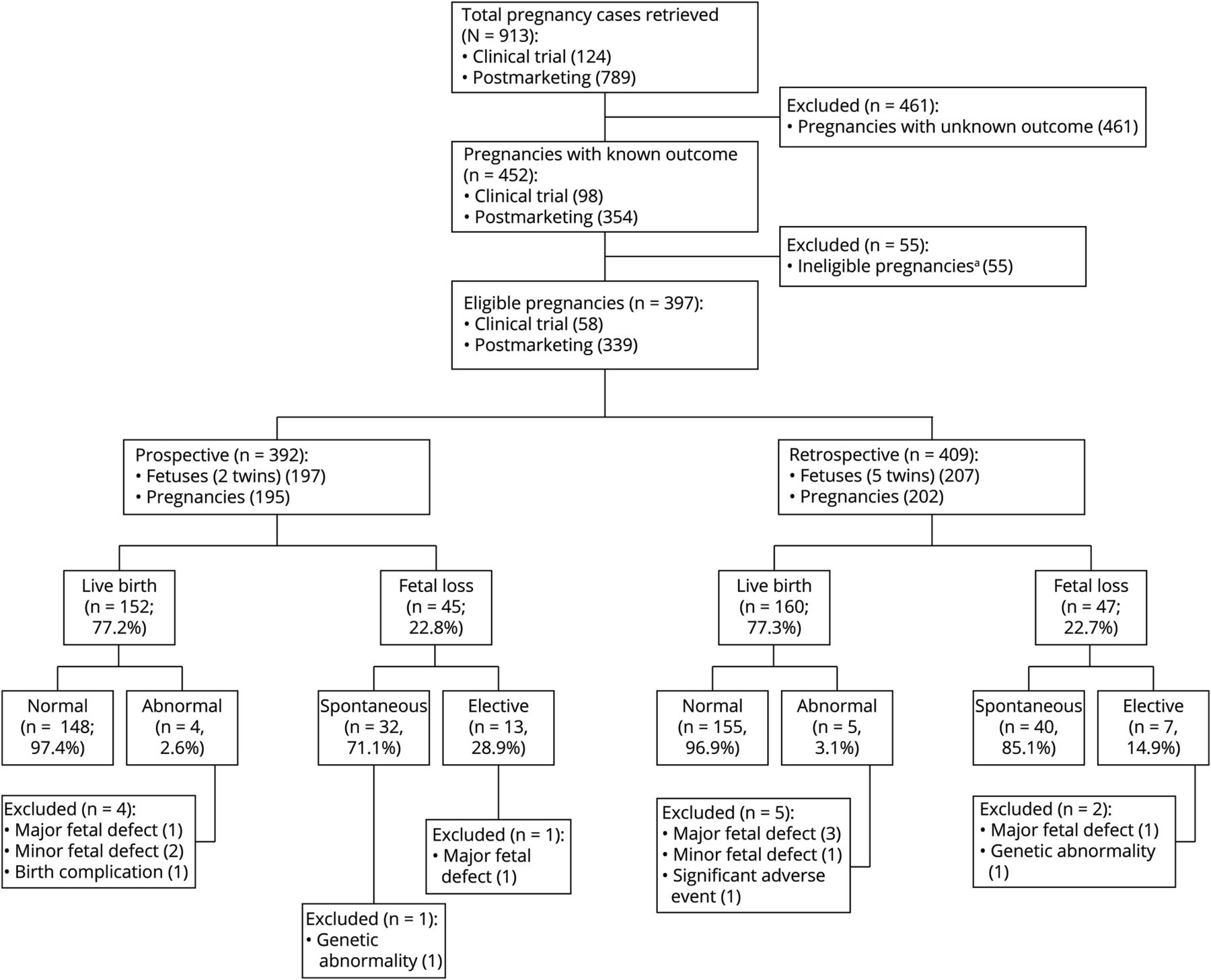总共913怀孕被检索(1990年1月1日- 12月31日,2018)从艾尔建全球安全数据库(图)。排除怀孕,未能满足入选标准(461怀孕没有一个已知的结果(标记为“未知”)和55不合格(标记为“不”,因为注射日期> 3个月前概念)的估计日期),397(397/913,43.5%)合格的怀孕与一个已知的结果包含在这个分析(图)。最合格的怀孕报道接触onabotulinumtoxinA(357/397, 89.9%),剩余的肉毒毒素/制造商未知(40/397,10.1%)。397怀孕,195(195/397,49.1%)前瞻性和202(202/397,50.9%)的回顾。肉毒毒素/制造商未知都回顾怀孕。
