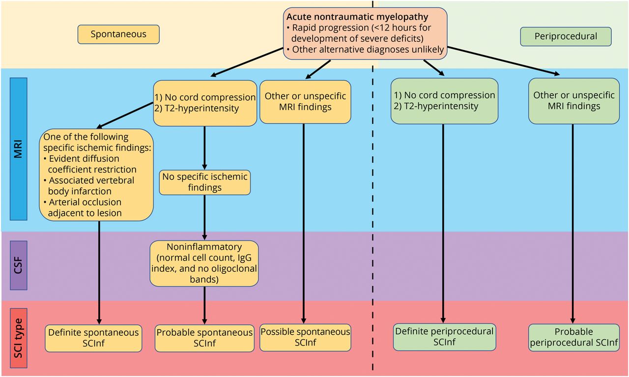 SCInf患者可能会出现一系列临床症状、反映脊髓损伤的分布。9描述的症状可能包括背痛,多达70%的病人,10不同程度的感觉或运动赤字包括四肢瘫痪或截瘫。11,12破坏膀胱、肠道和自主神经系统功能经常被报道。4,7,13可能的症状的多样性使得SCInf的诊断具有挑战性和难度区分于其他神经系统疾病如多发性硬化症、炎症性脊髓炎和传染性或恶性进程。4,7MRI在诊断中扮演着关键角色,可能协助SCInf从其他脊髓炎的分化。14然而,急性发作和随后的快速神经恶化的特征条件15和预后不良的暗示。11的重要性,没有明确的诊断标准或共识SCInf的优化管理,使病人延迟诊断的风险和不利的治疗。16