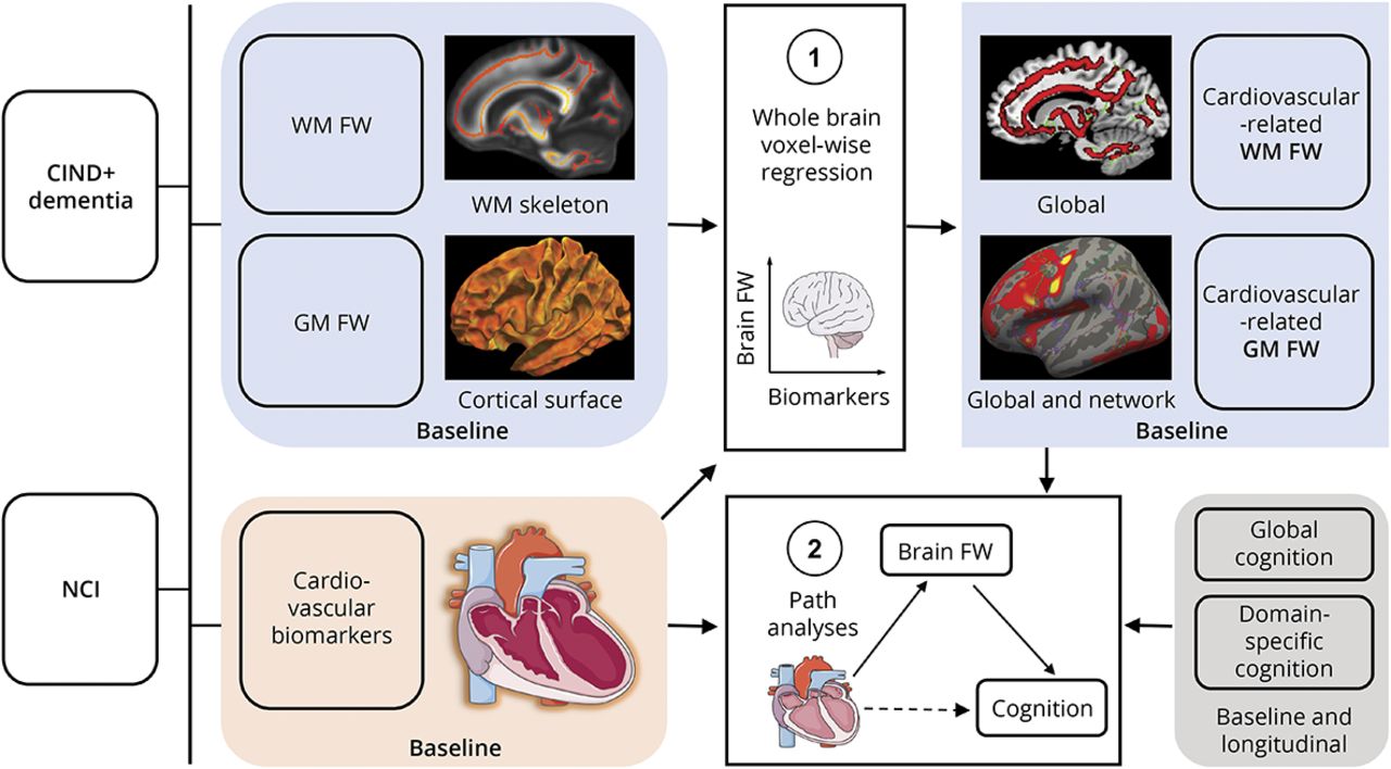 背景和目标人们越来越意识到“Heart-Brain连接,即心血管功能与认知。Diffusion-MRI研究报告更高的大脑自由水(FW)与脑血管疾病(CeVD)和认知障碍。在这项研究中,我们调查是否更高的大脑弗兰克-威廉姆斯与血液心血管生物标记和弗兰克-威廉姆斯是否介导血液生物标志物和认知之间的关系。
