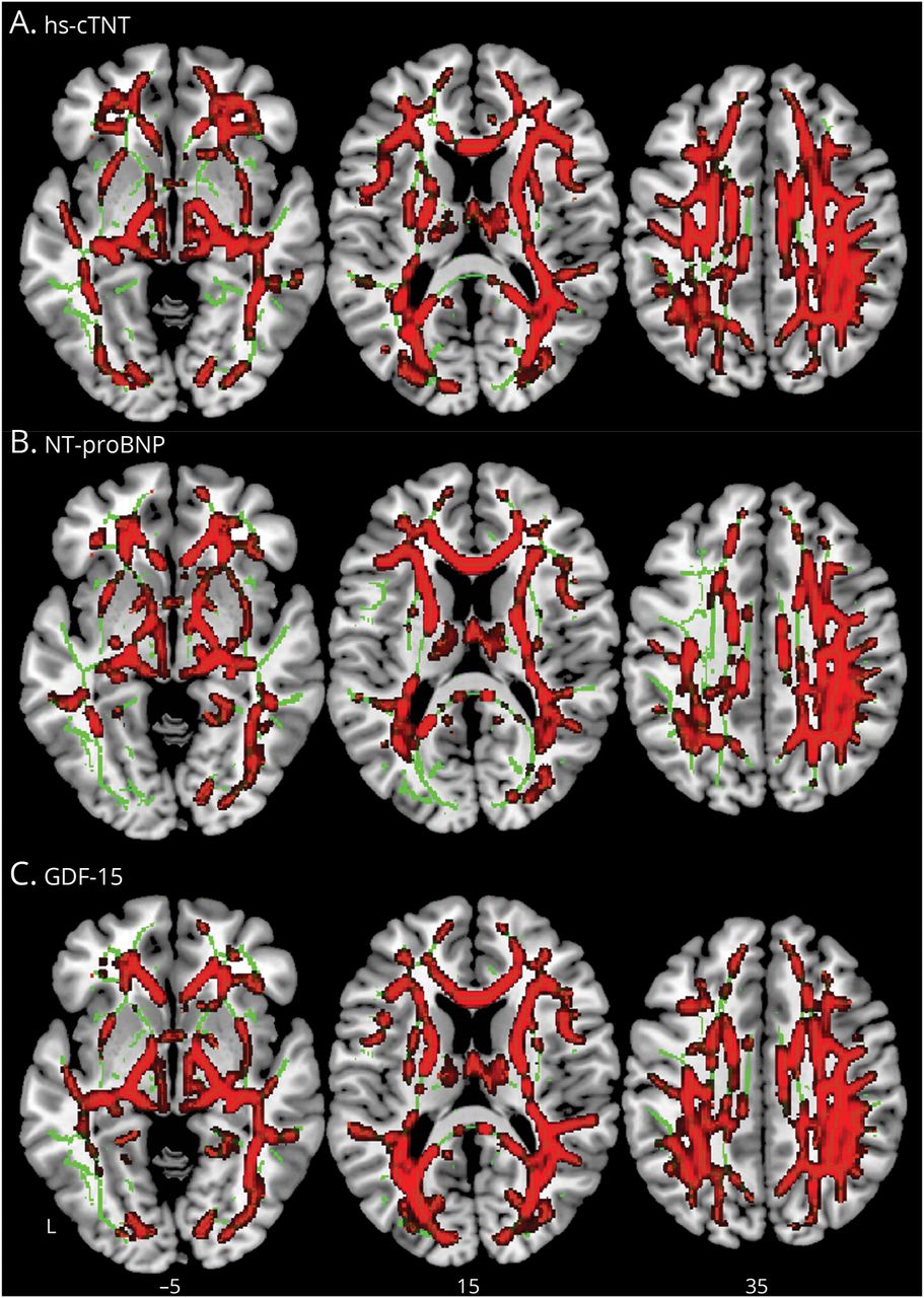 的整个大脑voxel-wise线性回归表明,更高的弗兰克-威廉姆斯在广泛的脑白质区域值与水平的提高(一)hs-cTNT NTpro-BNP (B)和(C) GDF-15。结果TFCE增强,在报道p< 0.01,FWE纠正。弗兰克-威廉姆斯=自由水;FWE = family-wise错误;GDF-15 15 =增长/分化因素;hs-cTnT =高灵敏度心脏临床;中位数水平以上病人= n端pro激素b型利钠肽;TFCE = threshold-free集群增强。