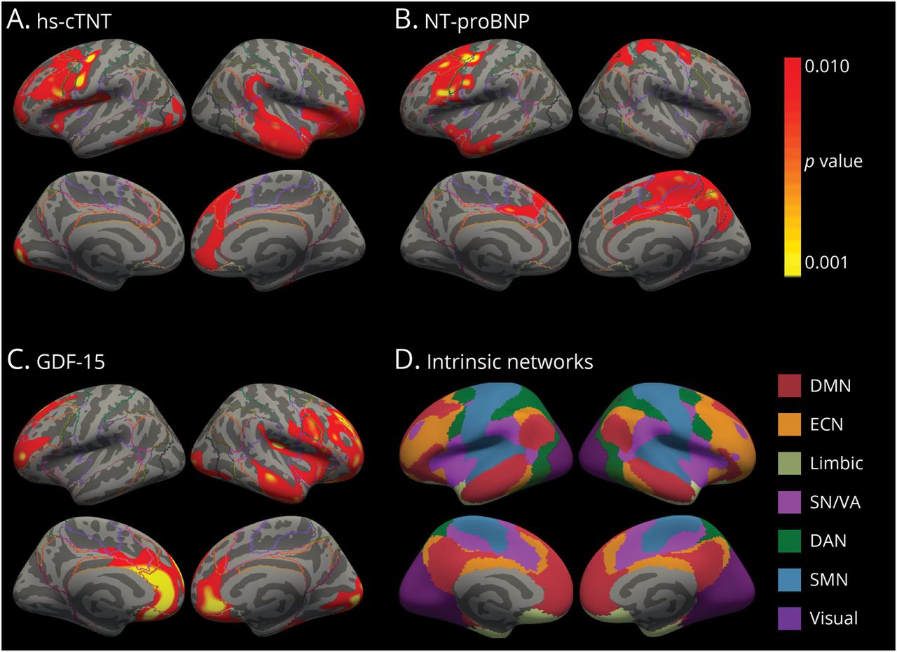 的整个大脑vortex-wise线性回归表明,更高的弗兰克-威廉姆斯值中额叶和颞叶和扣带回区域与水平的提高有关(一)hs-cTNT NTpro-BNP (B)和(C) GDF-15。姚(D)的功能内在网络分割。37结果报告p< 0.01,FWE纠正。丹=背关注网络;静=默认模式网络;ECN =执行控制网络;弗兰克-威廉姆斯=自由水;GDF-15 15 =增长/分化因素;hs-cTnT =高灵敏度心脏临床;中位数水平以上病人= n端pro激素b型利钠肽;SMN = somatomotor网络;SN / VA =腹关注网络。