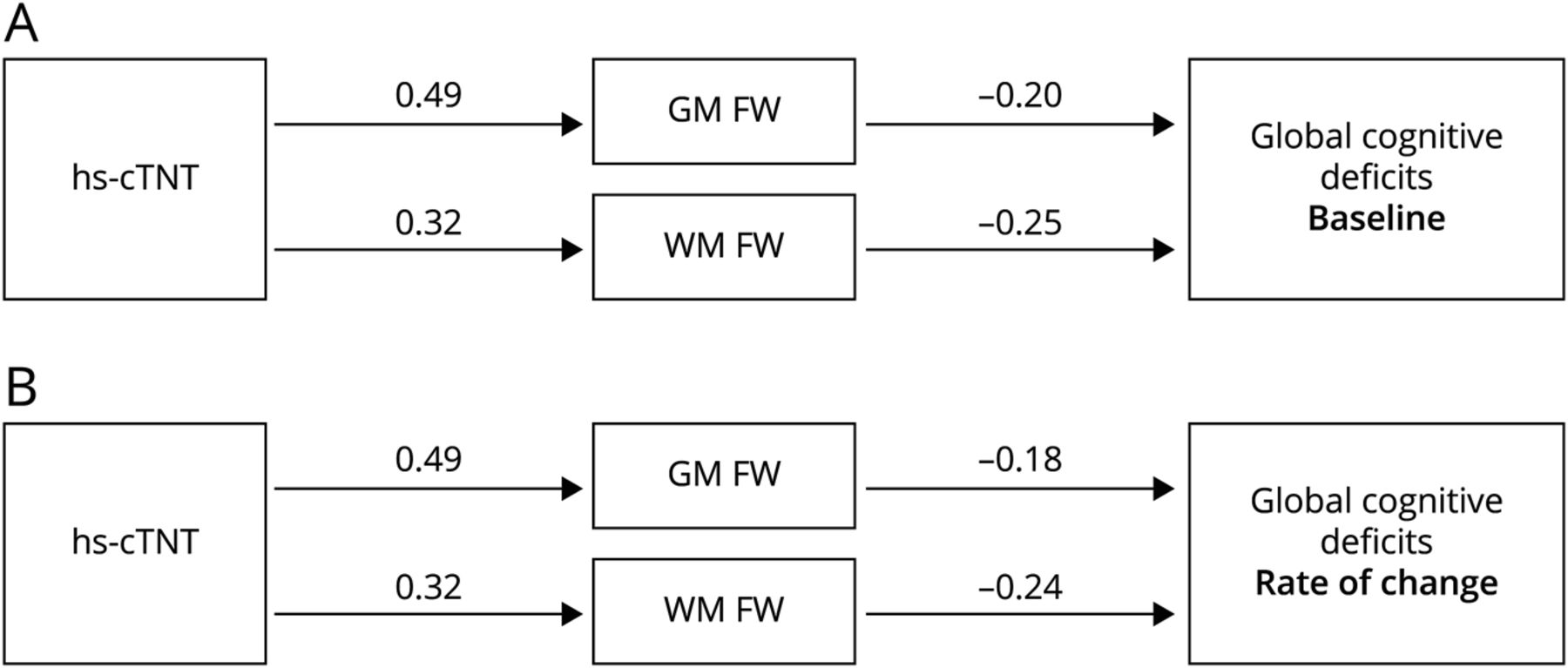 hs-cTNT原理图的路径分析。hs-cTNT在每个模型作为预测输入。平均WM弗兰克-威廉姆斯和平均通用弗兰克-威廉姆斯被添加作为介质。(一)全球基线认知障碍和(B),下降的速度随时间(5年)被视为结果。数字路径表明标准化系数显著。弗兰克-威廉姆斯=自由水;通用=灰质;hs-cTnT =高灵敏度心脏临床;WM =白质。