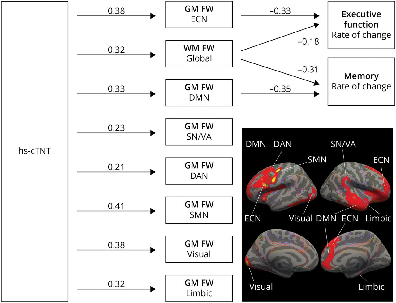 原理图的路径分析。hs-cTNT输入作为一个预测。平均WM弗兰克-威廉姆斯和平均通用弗兰克-威廉姆斯来自7 Yeo的内在网络添加介质(见与彩色分割边界的底部)。利率执行和内存域的变化随时间(5年)被视为结果。数字路径表明标准化系数显著。丹=背关注网络;静=默认模式网络;ECN =执行控制网络;弗兰克-威廉姆斯=自由水;通用=灰质; hs-cTnT = high-sensitivity cardiac troponin-T; SMN = somatomotor network; SN/VA = ventral attention network; WM = white matter.
