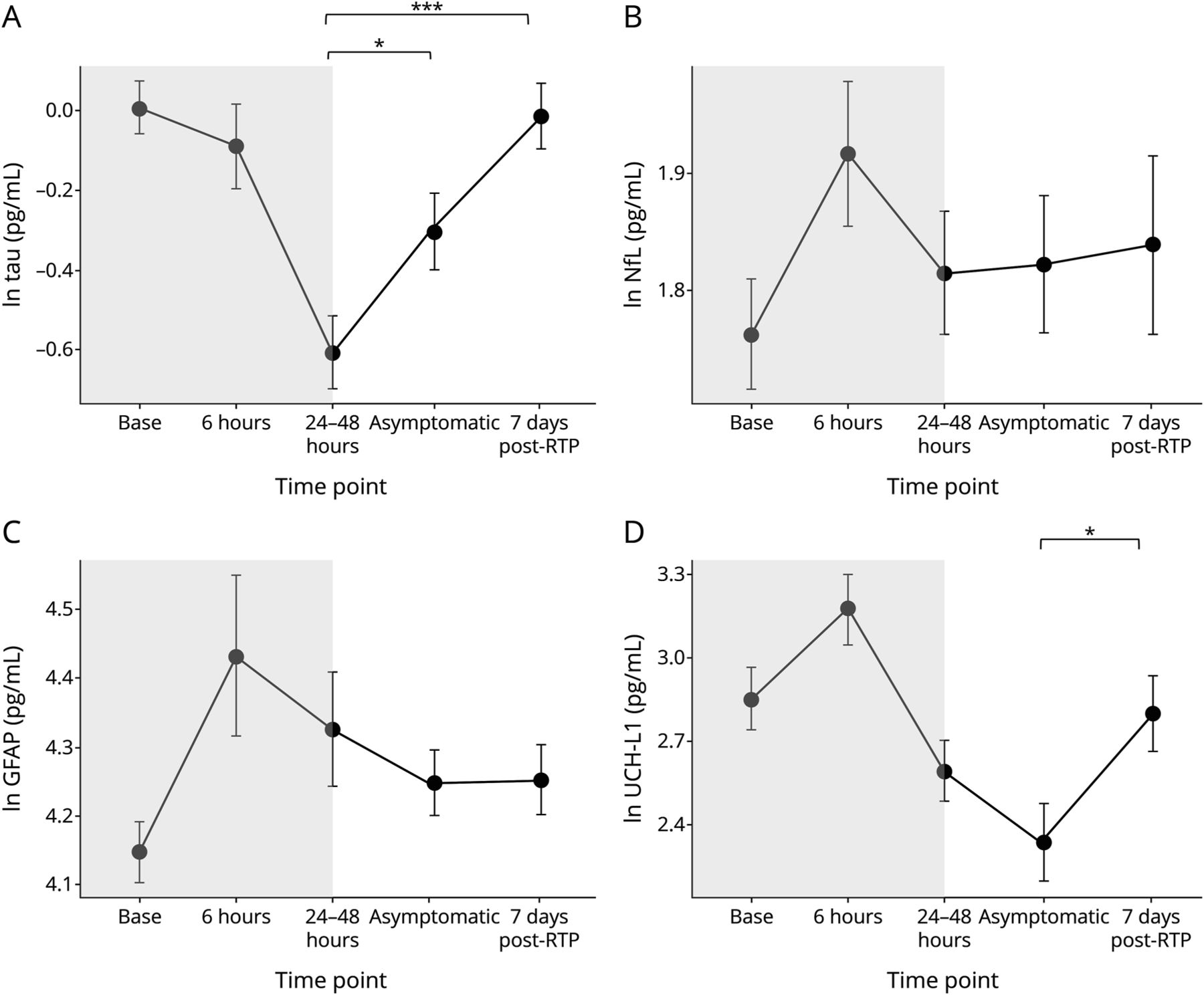 这血液生物标志物数据的子集的纵向轨迹符合一个更大的医疗财团的研究主要关注血液生物标志物和临床结果之间的关系的措施。11纵向血液生物标志物的变化显示急性反应SRC与峰值的变化在NfL的6小时postinjury, GFAP和UCH-L1。τ似乎稍微延迟反应,在postinjury 24 - 48小时之内触底。在24 - 48小时postinjury指向return-to-play后7天时间点,τ级血液中继续发展并返回到基线水平,而其他血液生物标志物是相对稳定的。
