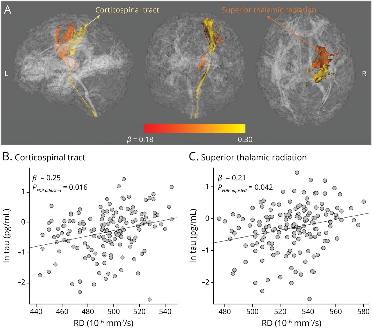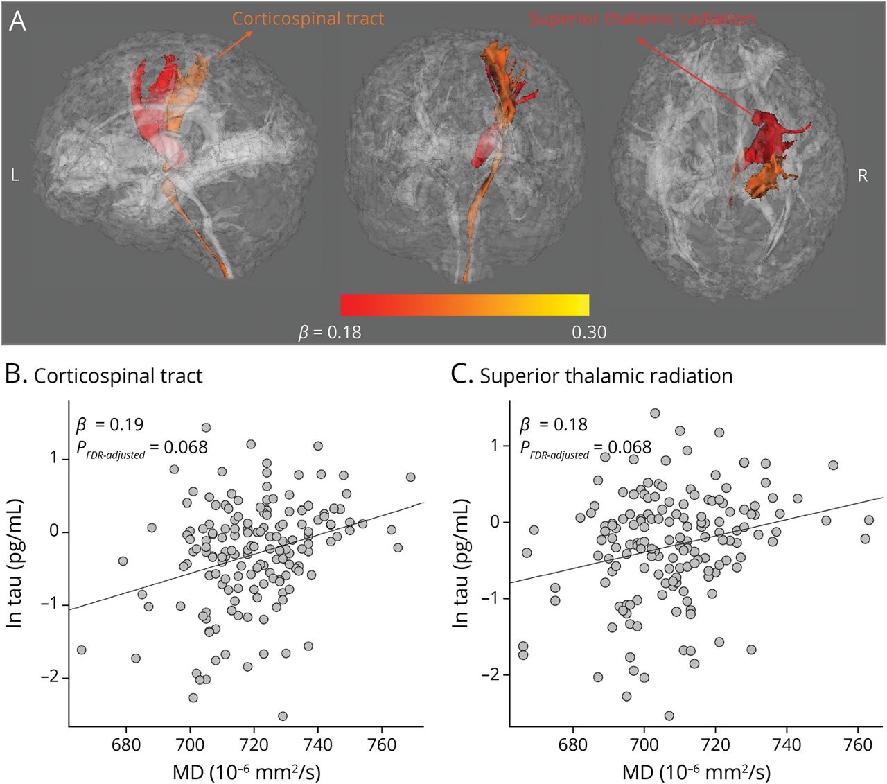 罗斯福调整后,采访了重大关联与τ的皮质脊髓束(β系数= 0.25,pFDR-corrected< 0.05,图3中,A和B)和优越的丘脑辐射(β系数= 0.21,pFDR-corrected< 0.05,图3中,A和C)。等离子τ水平高与高架RD在这些2白质束。MD还演示了同样显著关联与τ大片意义较弱(0.05 <pFDR-corrected< 0.1,图4)。类似于RD,等离子τ水平高与MD在正确的皮质脊髓束和优越的丘脑辐射(图4中,B和C)。