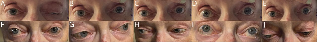 眼外运动显示左侧上睑下垂和完整的眼肌麻痹与眼球运动(一)休息,(B)左侧的注视,(C)向右,向上(D)的目光,(E)向下凝视。改善眼外运动和离开最初的诊断和治疗上睑下垂5个月后与大剂量甲基强的松龙紧随其后的是长时间的静止强的松锥(F), (G)左侧的注视,向右(H),(我)向上凝视,目光向下(J)。