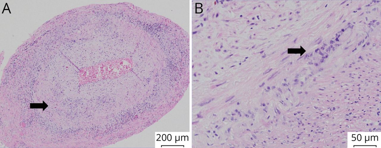GCA,也称为颞动脉炎,是一种系统性血管炎影响大、中型动脉,偏爱颅颈动脉的分支。根据美国风湿病学院1990年标准,GCA诊断的患者中有3个或更多的下列:≥50岁,新出现的局部头痛、颞动脉温柔或减少颞动脉脉搏、ESR≥50毫米/小时升高,动脉活检显示坏死性动脉炎,表现为优势的单核细胞和多核巨细胞浸润或肉芽肿性过程。1我们的病人符合这些标准,5的5确认甘氨胆酸的诊断。