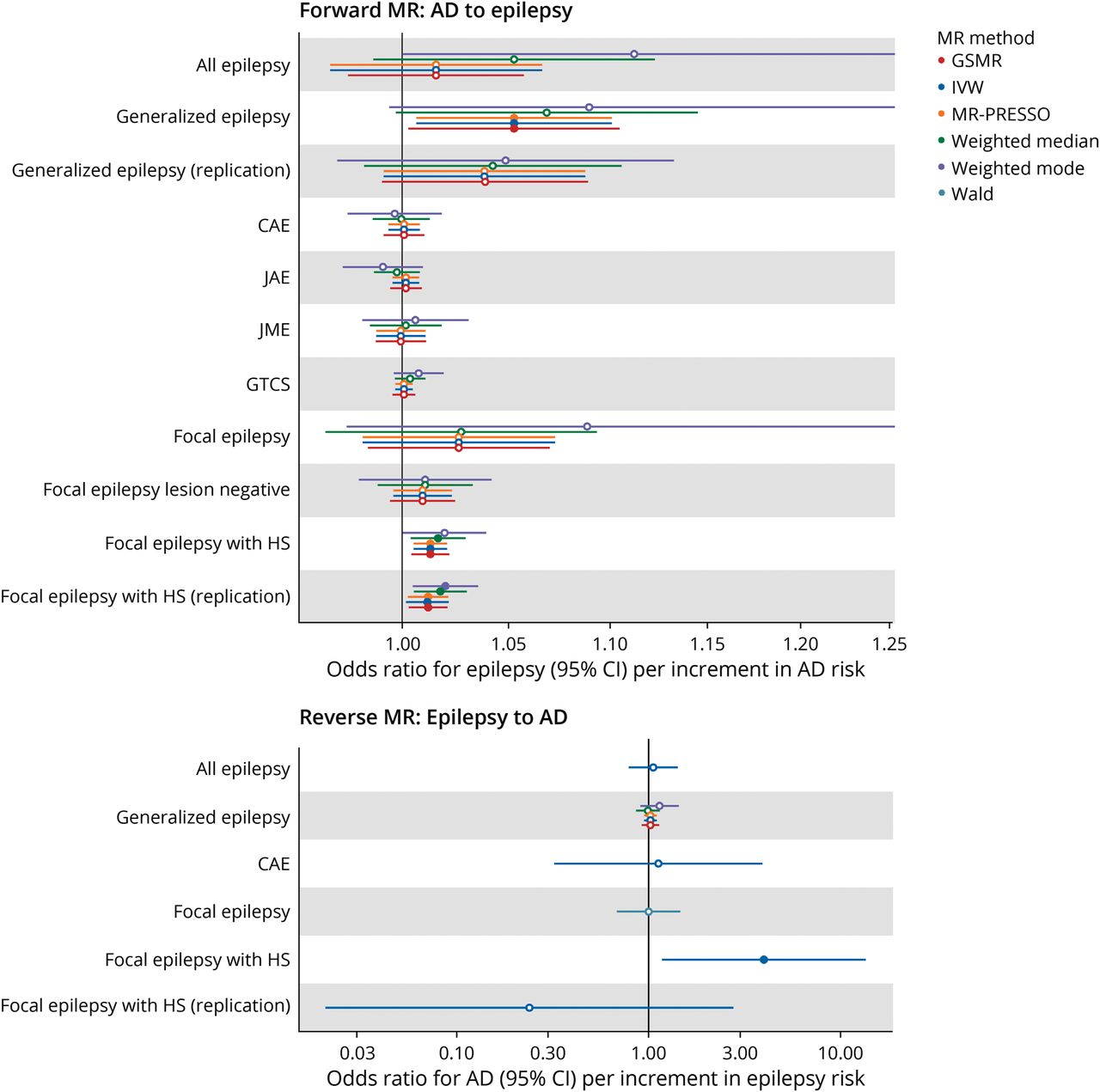 广告=阿尔茨海默病;CAE =儿童失神癫痫;焦HS =与海马硬化灶性癫痫;GSMR =广义先生总结基于数据;gtc =全身性癫痫伴tonic-clonic发作;IVW =方差倒数加权;JAE =少年失神癫痫;期刊=青少年肌阵挛癫痫;先生=孟德尔随机化;MR-PRESSO =先生多向性余量和和离群值。