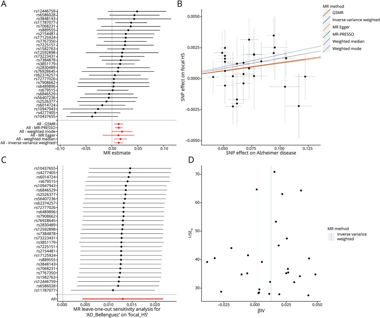 (一)森林块焦HS每增加1 SD广告风险。(B)散点图显示遗传的影响仪器对焦点HS广告风险对他们的影响。(C)没有实质性改变IVW因果估计在删除所有的仪器snp。(D)漏斗图显示不对称。广告=阿尔茨海默病;焦HS =与海马硬化灶性癫痫;GSMR =广义先生总结基于数据;IVW =方差倒数加权;先生=孟德尔随机化;MR-PRESSO =先生多向性余量和异常值; SNP = single-nucleotide polymorphism.