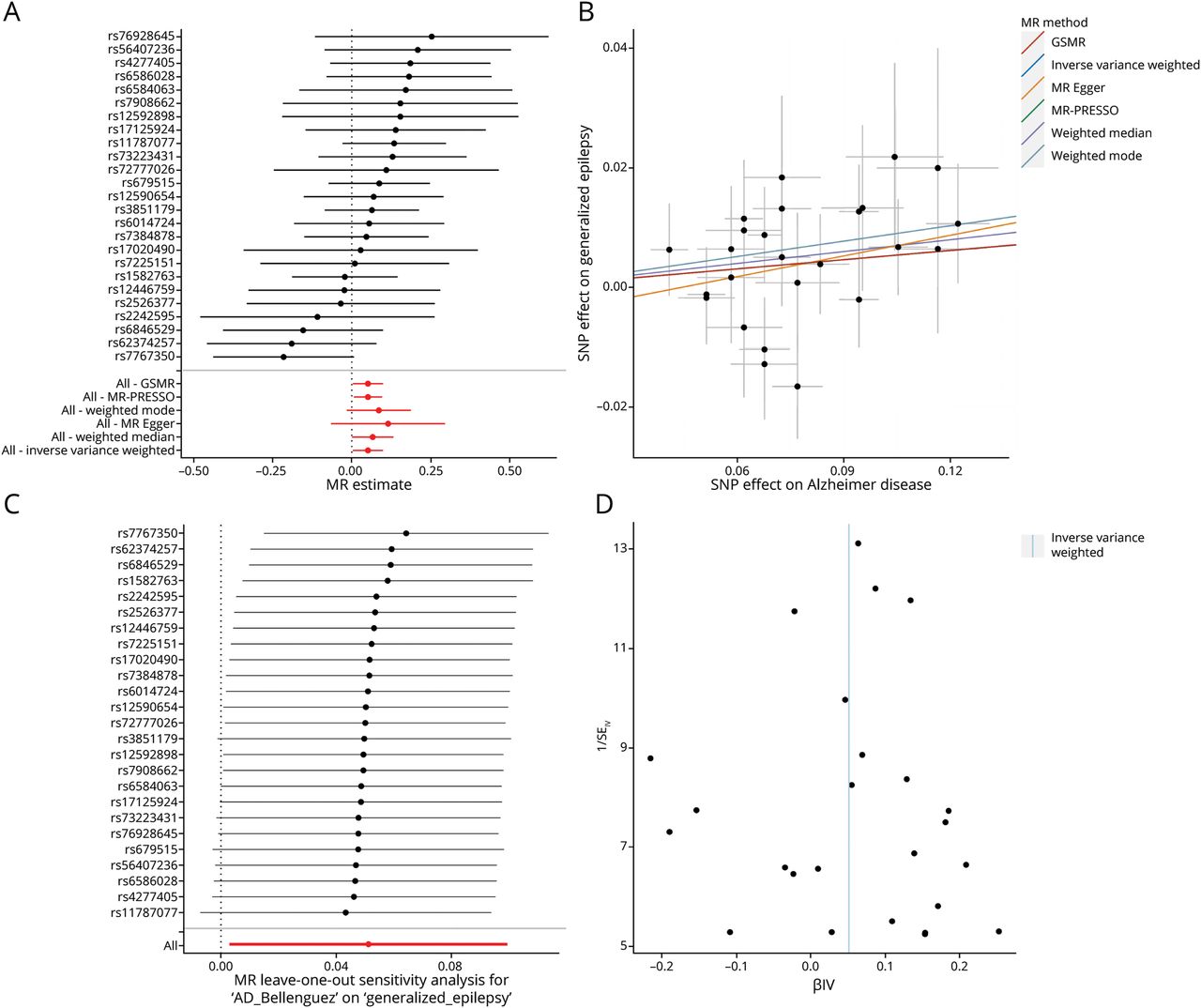 方法遗传工具获得大规模的全基因组分析的广告(N案例/代理N 188金宝慱官网下载= 111326,控制= 677663),脑脊液生物标志物的广告(Aβ42 pTau, N = 13116)、和癫痫(N情况下N = 15212,控制= 29677)的欧洲血统。癫痫表型包括所有癫痫、广义癫痫、局灶性癫痫,儿童失神癫痫,少年失神癫痫,青少年肌阵挛癫痫、全身性癫痫伴tonic-clonic发作,局灶性癫痫与海马硬化(焦HS),和lesion-negative局部癫痫。主要分析运用广义总结基于数据的敏感性分析包括方差倒数加权,先生先生多向性余量和离群值,MR-Egger,加权模式,加权值。