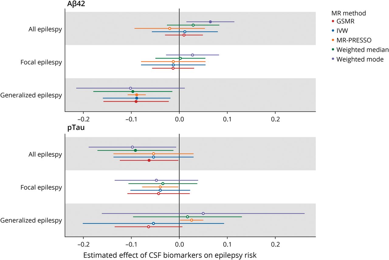 Aβ42之间的关系和癫痫,pTau与广义癫痫、多向性MR-PRESSO方法发现,这里给出的结果是outlier-corrected。Aβ=β-amyloid;GSMR =广义先生总结基于数据;IVW =方差倒数加权;先生=孟德尔随机化;MR-PRESSO =先生多向性余量和异常值;pTau =磷酸化τ。