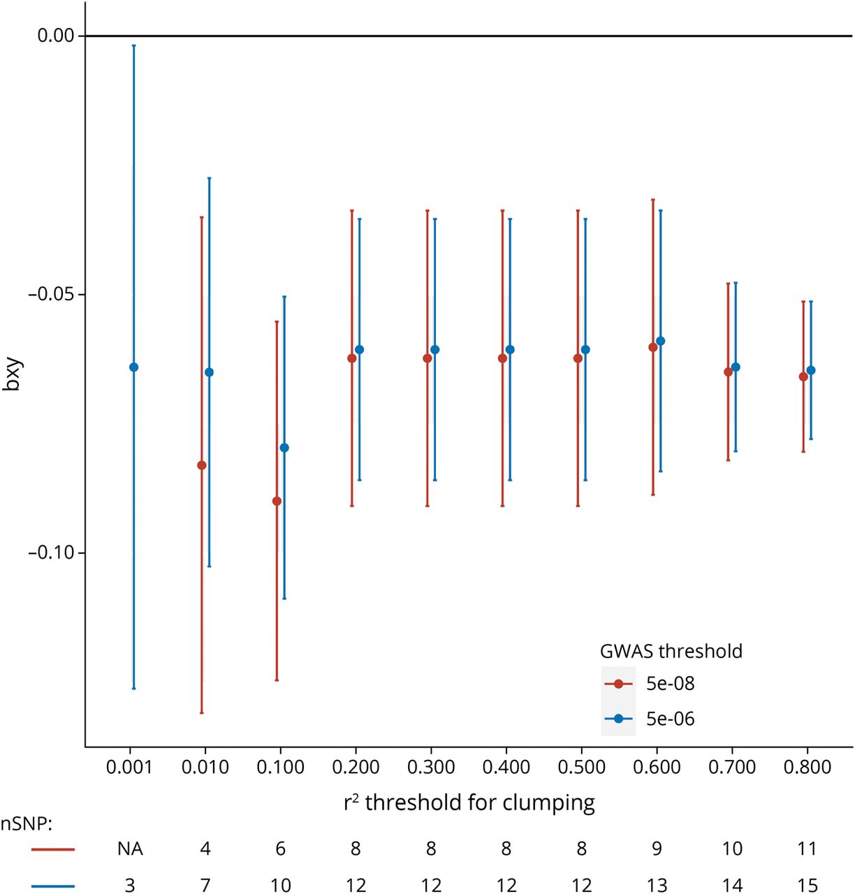 水平的CSF Aβ42和pTau接触时,我们成群snpr2< 0.1和5 e-8作为显著性水平。敏感性分析,不同的聚集阈值(0.001,0.01,0.2,0.3,0.4,0.5,0.6,0.7,0.8)和不同的GWAS重要性水平(5 e-8 5 e-6)。因为GSMR占微弱的相关性由于连锁不平衡,放松凝结阈值可能增加的数量遗传工具,允许增加统计力量。
