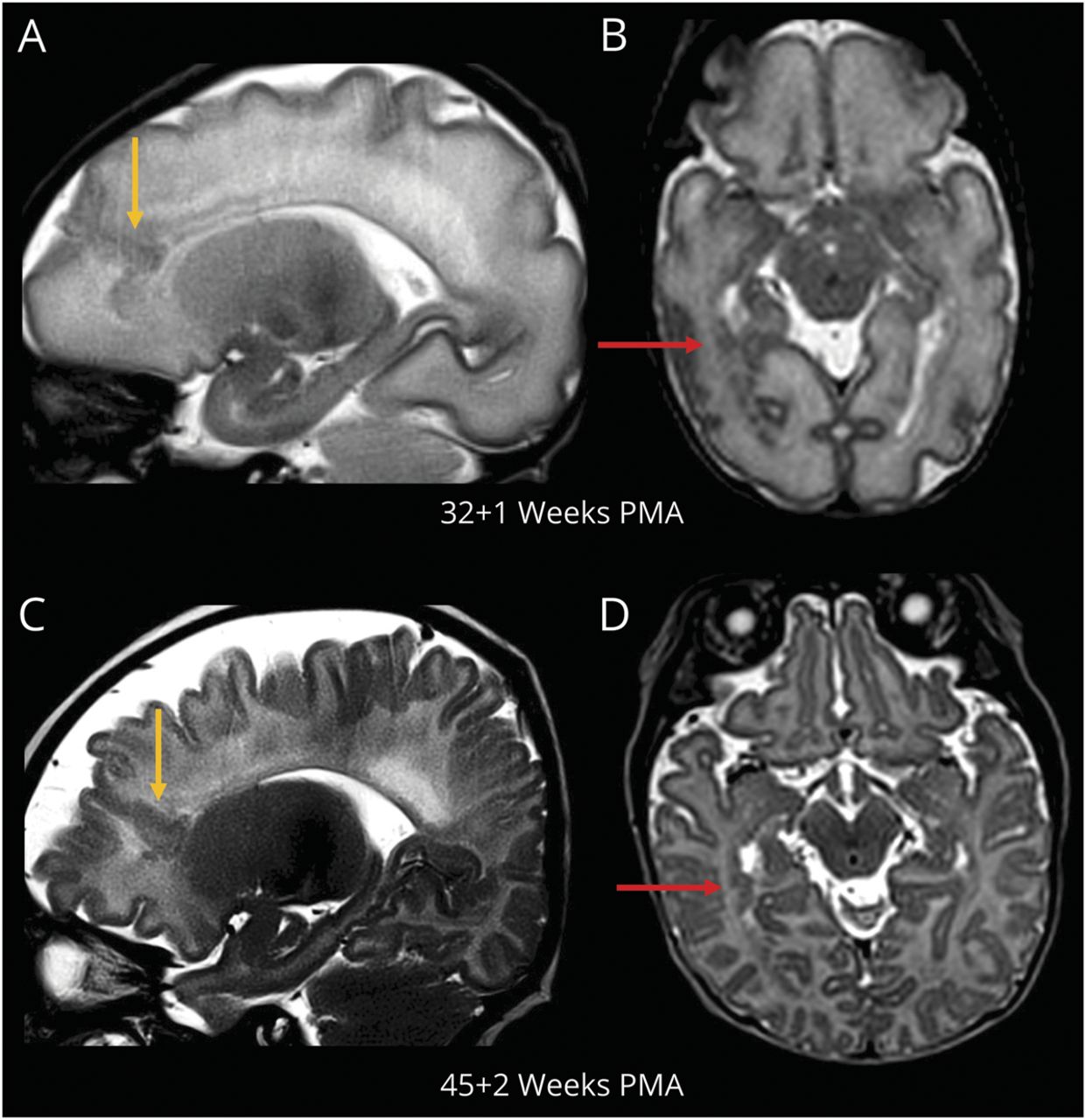 男性新生儿出生在28 + 5周postmenstrual年龄38岁(PMA)通过剖腹产的母亲出现早产。怀孕是复杂的一集细菌性阴道炎和宫颈的缩短。产前超声检查显示没有大脑异常。胎盘病理显示病态附着胎盘和脐带的边缘插入。出生时,婴儿需要插管。阿普加分数1和5 1和5分钟,分别。他的出生体重1195克(52百分位孕龄(GA)),他的头围是28厘米(GA) 88。他的新生儿当然是不起眼的除了集呼吸暂停/心动过缓、管理与非侵入式通风。他表现出一个正常的神经系统检查在他入学。他第一次超声波,在生命的2天(29周PMA),是可疑早期缺血性改变大脑前部和双边枕区域。 Subsequent head ultrasounds were normal. Two research brain MRIs were conducted in the neonatal period. His first brain MRI was performed at 32 + 1 weeks PMA and showed periventricular nodular heterotopia in the right temporal and occipital regions associated with right frontal transmantle dysplasia and polymicrogyria (图,一个和B)。第二个大脑核磁共振在45 + 2周PMA证实存在多个室旁结节性异位病灶的右枕叶和颞角和更好的特征与右额叶皮质畸形closed-lip schizencephaly (图中,C和D)。遗传调查显示正常的微阵列和杂合变异体的未知的意义LAMC3和WDR62基因在大脑畸形基因面板。虽然在这些基因变异与MCD相关联,继承是常染色体隐性;因此,他们没有解释大脑核磁共振的发现。神经发育的结果评估纵向修正5岁。在18个月里,他看到一个正常的神经系统检查和神经发育评分,评估量表的婴儿和蹒跚学步的Development-III (Bayley-III)。在36个月,他的认知和语言的性能都在较低的范围内正常(Bayley-III认知得分85,Bayley-III语言得分86),和他的运动成绩是在正常范围内(Bayley-III电动机得分94)。5岁时,他表现出一个正常的神经系统检查,一个正常的认知评估基于情报的韦氏小学和幼儿园规模(WPPSI),第四版全面智商(总分92,30日百分位),基于运动和一个正常的汽车性能评估电池为儿童,第二版(M-ABC2)(总分69,第25百分位)。