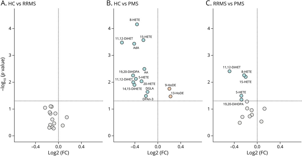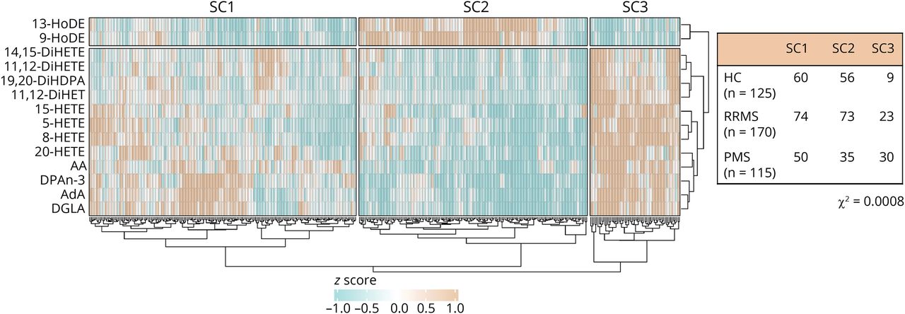 结果gydF4y2Ba研究样本包括170名复发患者汇款(名RRMS)女士,115年进步(PMS)女士,患者和125高碳钢。LM的PMS患者明显不同于那些名RRMS患者和高碳钢,特别是经前综合症患者显示高浓度的几个花生四烯酸(AA)衍生品。特别是,15-hydroxyeicosatetraenoic酸(HETE) (gydF4y2BargydF4y2Ba= 0.24,gydF4y2BapgydF4y2Ba< 0.001)(平均相关gydF4y2BargydF4y2Ba= 0.2,gydF4y2BapgydF4y2Ba< 0.05)与eds和sNfL等临床和生化参数。此外,15-HETE水平较高与较低的总大脑(gydF4y2BargydF4y2Ba=−0.24,gydF4y2BapgydF4y2Ba= 0.04)和深部灰质卷(gydF4y2BargydF4y2Ba=−0.27,gydF4y2BapgydF4y2Ba= 0.02)患者经前综合症和高损伤卷(gydF4y2BargydF4y2Ba= 0.15,gydF4y2BapgydF4y2Ba在所有的pwm = 0.03)。gydF4y2Ba