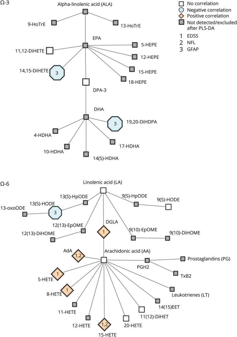 讨论gydF4y2Bapwm相同的出生年,我们表明,ω-3ω-6 LMs与残疾,生化参数(sNfL GFAP)和MRI的措施。此外,我们的研究结果表明,尤其是在经前综合症患者,高浓度的AA通路的特定产品,如15-HETE,与神经退化过程。我们的研究结果强调的潜在相关性ω-6 LMs的发病机理。gydF4y2Ba
