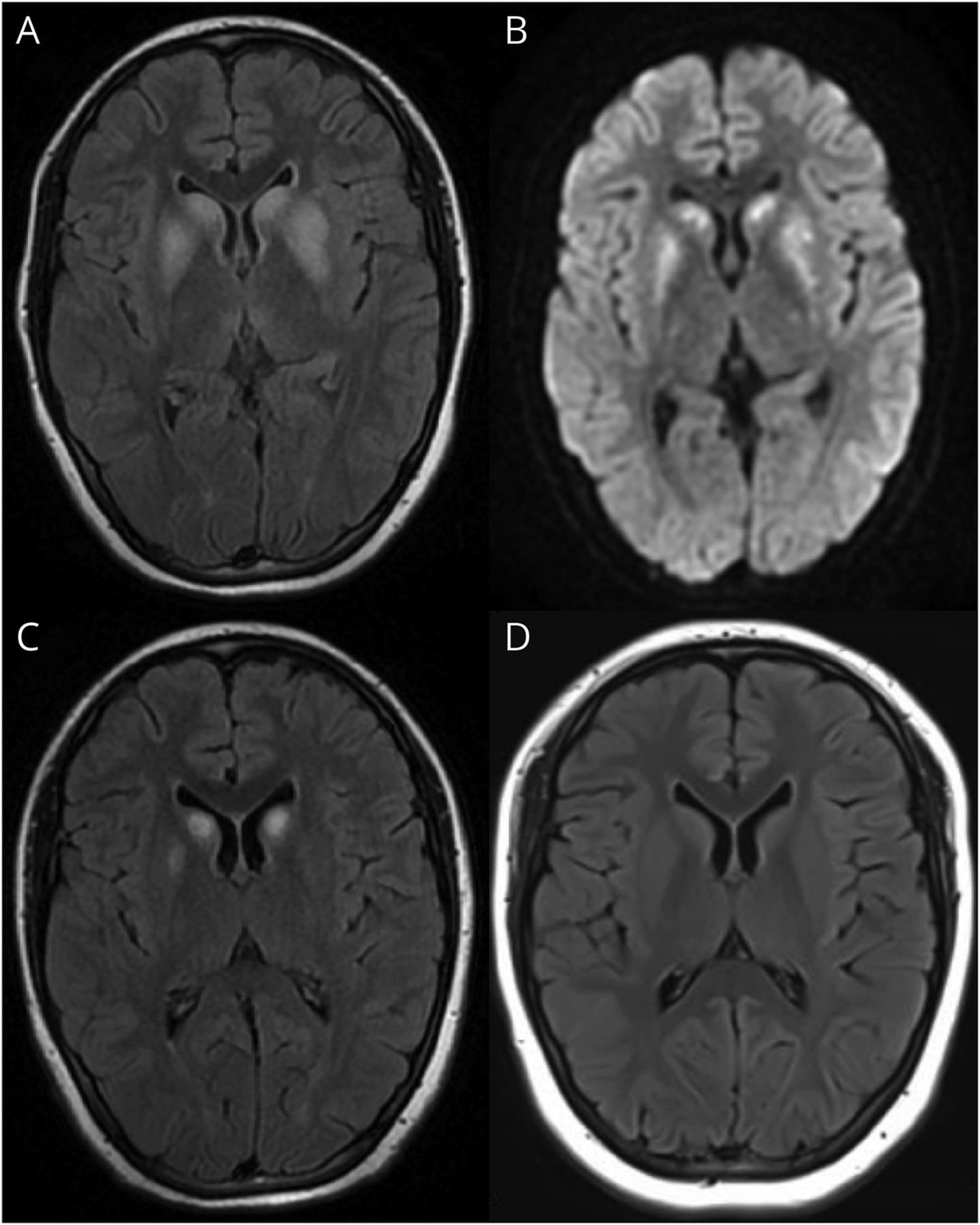住院期间,我们观察到轻微受损的短期记忆力和稍微延长反应时间在病人相比,指出在入学。随后的认知评估揭示了注意力,轻度损伤计算,和记忆领域,评价语言和执行功能域还没有因为构音障碍和肢体的弱点。认知障碍提出脑功能障碍;因此,脑MRI表现。对称双边基底神经节的损伤被发现与hyperintensity T2 fluid-attenuated反转恢复,diffusion-weighted成像(驾车)hyperintensity,相应的表观扩散系数hypointensity,没有对比增强(图1中,A和B)。