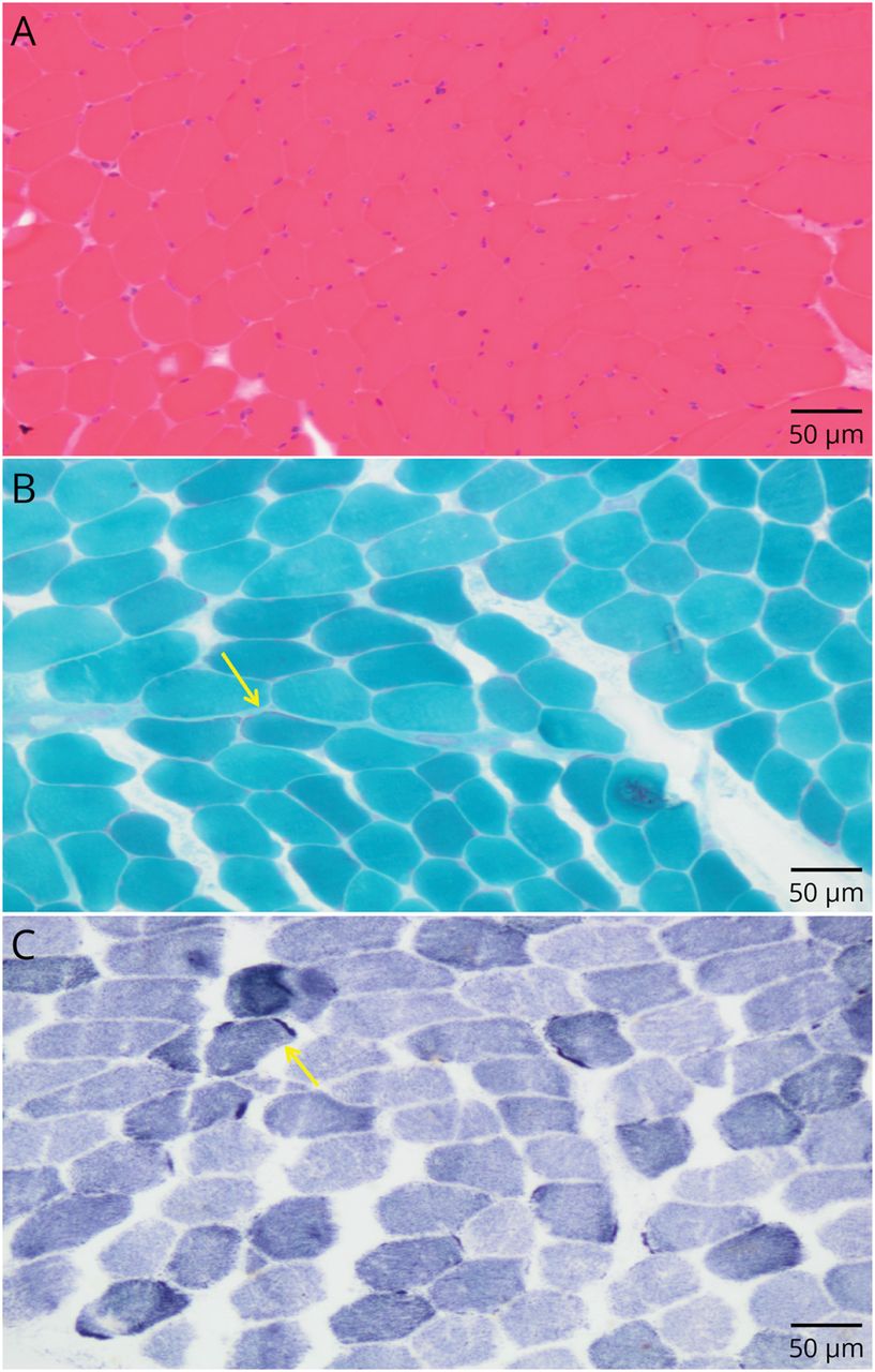 (一)苏木精和伊红染色显示大小不一的肌纤维。增加线粒体在某些subsarcolemmal地区观察基于(B)修改Gomori三色的染色和(C)琥珀酸脱氢酶染色(放大200×)。