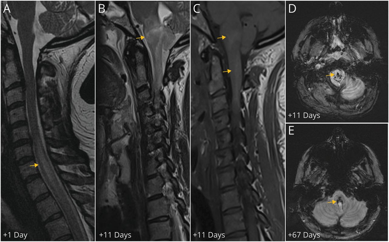 她四肢瘫痪和机械通风。重复神经影像学在2个月显示改善低颈t2加权hyperintensity和演进瑞士hypointensity髓质(图1 e)。在3个月,扩大残疾状态量表(eds)为9.0,和修改兰金得分(夫人)5。