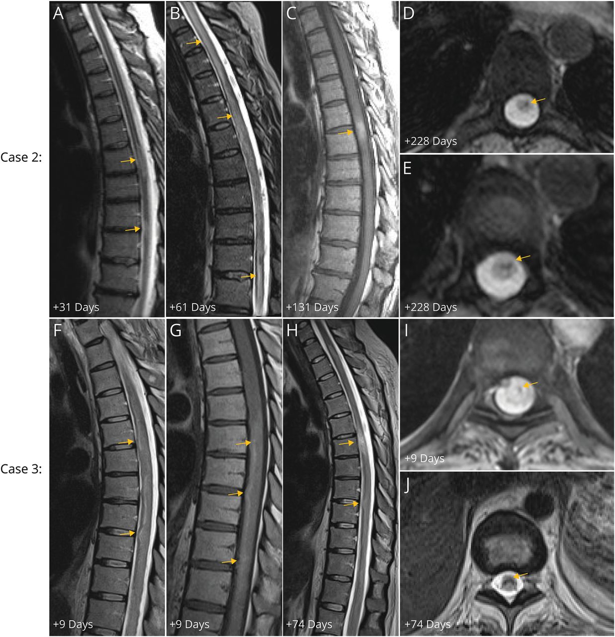 一名26岁的妇女承认COVID-19心肌炎、心原性休克,multiorgan失败。十天的地塞米松有症状感染治疗的一部分。她接种adenovirus-vectored COVID-19疫苗(詹森生物技术)5个月前感染症状。四个星期进她的病,她急性提升感官损失,其次是弛缓性截瘫和无反射,达到最低点1周。演示的脑脊液神经症状(3天后)23红细胞/μL 3白细胞/μL嗜中性粒细胞(75%),36 mg / dL的蛋白质,与寡克隆。胸椎MRI(9天后神经症状)显示膨胀性的t2加权hyperintensity (T1本土precontrast T1 hyperintensity和microhemorrhage t2加权二维多次回声序列(图2中,F, G,和我)。主动脉造影是正常的。重复CSF分析(后19天前)显示2红细胞/μL, 1白细胞/μL淋巴细胞(55%),36 mg / dL的蛋白质,略高免疫球蛋白g指数(0.67)。传染病研究包括CSF HSV (PCR)、带状疱疹、巨细胞病毒和eb病毒血清学显示负面结果。血清HIV、安娜和CSF自身免疫性脑病自身抗体面板显示负面结果(梅奥诊所实验室)。血小板、PT和APTT是正常的。预防肝素皮下(每天两次5000单位)管理。血清AQP-4免疫球蛋白和MOG CBA的免疫球蛋白抗体显示消极的结果。她收到了5剂量的1 g IVMP(13天后神经症状),其次是口服强的松锥(每天40毫克,锥形每周10毫克)。重复成像在2个月显示持续的t2加权hyperintensity和出血涡轮旋转回声序列(图2中,H和J)。在5个月,她仍然截瘫的(= 5,夫人eds = 8.0)。