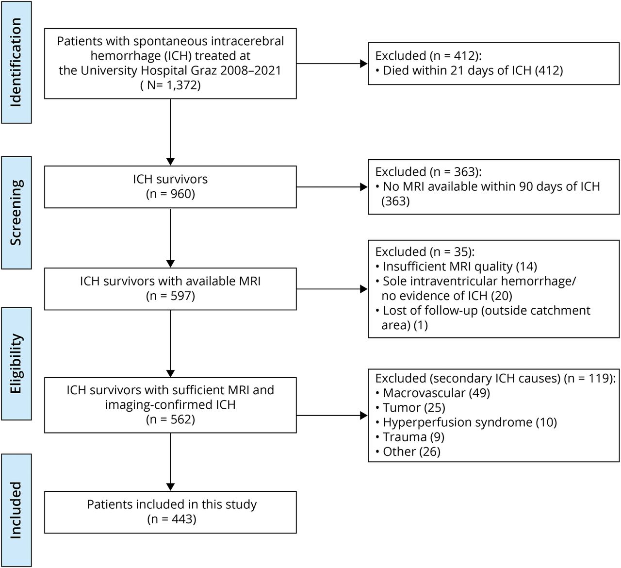 我们回顾性所有患者首次我对待2008年和2021年之间在格拉茨大学医院,奥地利(n = 1372)。我们中心作为主要中风中心格拉茨市及其周边地区,三级护理中心施第里尔的联邦国家。筛选了使用icd - 10诊断(I61的组合。X或I62.9)和自由文本搜索在放电的文章包括放射报告。识别和排除的患者是由一个训练有素的神经与血管的专家基于电子健康记录(S.F.H.)。在我们中心,MRI表现为标准治疗的住院检查我病因在整个研究期间,除非有禁忌症或高依赖性。还包括CT血管造影术诊断评估所有患者和CT血管造影术造影术先生或先生造影术对疑似脑静脉窦血栓形成。数字减影血管造影、MRI重复或两人都经常在患者不明原因(隐)基于每周我神经与血管的会议,包括血管神经,神经放射,神经外科医生。