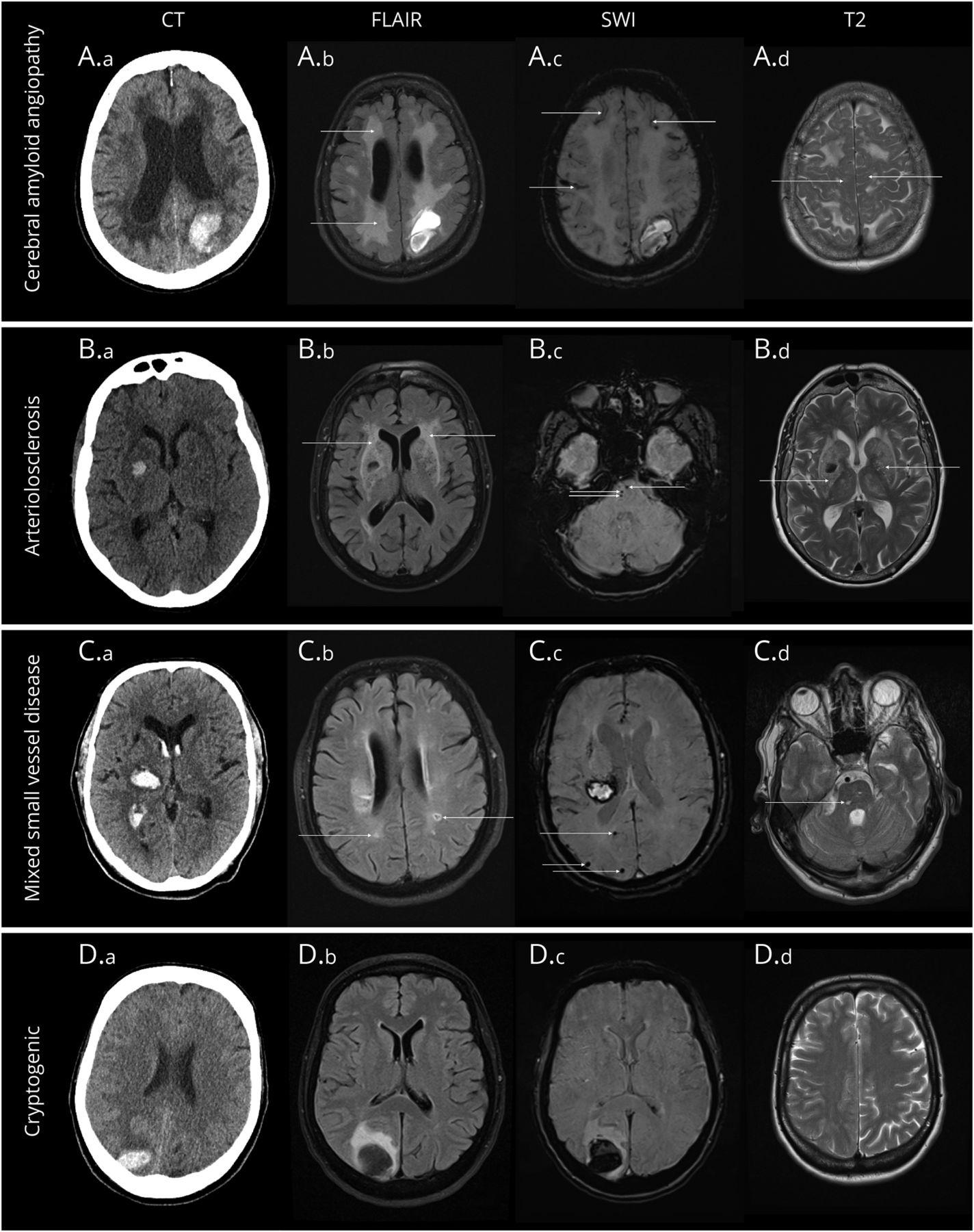 绿色箭头表示不同功能的脑小血管疾病(计算)。上面一行:大叶性患者枕我由于可能的脑淀粉样血管病(一位)。MRI显示广泛的融合性的白质hyperintensities (A.b),传播皮质表面铁尘肺,无数大叶性microbleeds(交流),和严重扩大血管周的空间在中枢semiovale(公元)。这个病人有反复大叶性指数我。我2个月后第二行:患者深我在基底神经节(本科)由于小动脉硬化。MRI显示汇合的白质hyperintensities(反方向),深microbleeds(公元前)和严重扩大血管周的空间的基底神经节(B.d)。第三行:病人丘脑我(一个)和混合计算功能。MRI描绘了早期汇合的白质hyperintensities (C.b),可见(C。b, C.d),和几个大叶性microbleeds (C。c,进一步深microbleeds没有显示)。底下一行:患者不明原因引起的大叶性枕我(地方检察官)没有任何迹象的圣言(除了一些点状的白质hyperintensities D.b)。详细的检查包括重复MRI和数字减血管病排除结构或macrovascular原因。