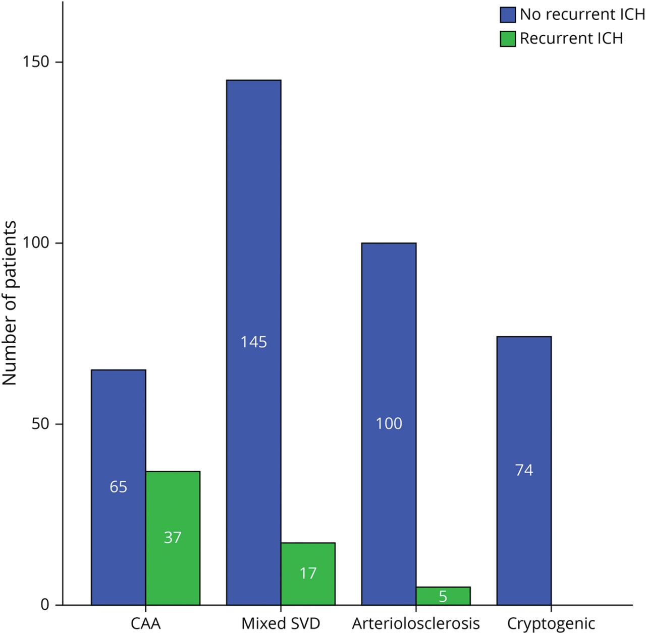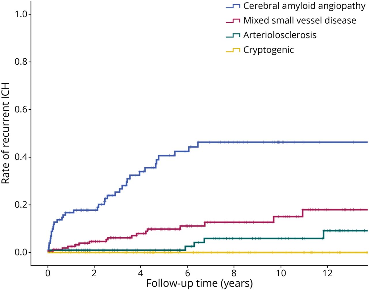 在这个单中心研究调查连续患者的复发率与自发的我接受了脑部MRI对根本原因进行分类,我们做了2个新的观测与潜在的临床意义。首先,我们已经确认mri病原学的基础计算类型的分类(CAA vs non-CAA以外)是一个关键因素在评估我的复发风险。其次,在不明原因引起的我(即患者。,我without a macrovascular, structural, or other secondary cause and no evidence of SVD on MRI), not a single recurrent ICH occurred over a long follow-up period (510 person-years); this finding was also confirmed in a well-defined external validation cohort.