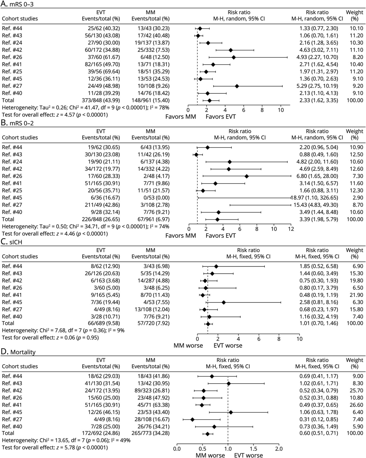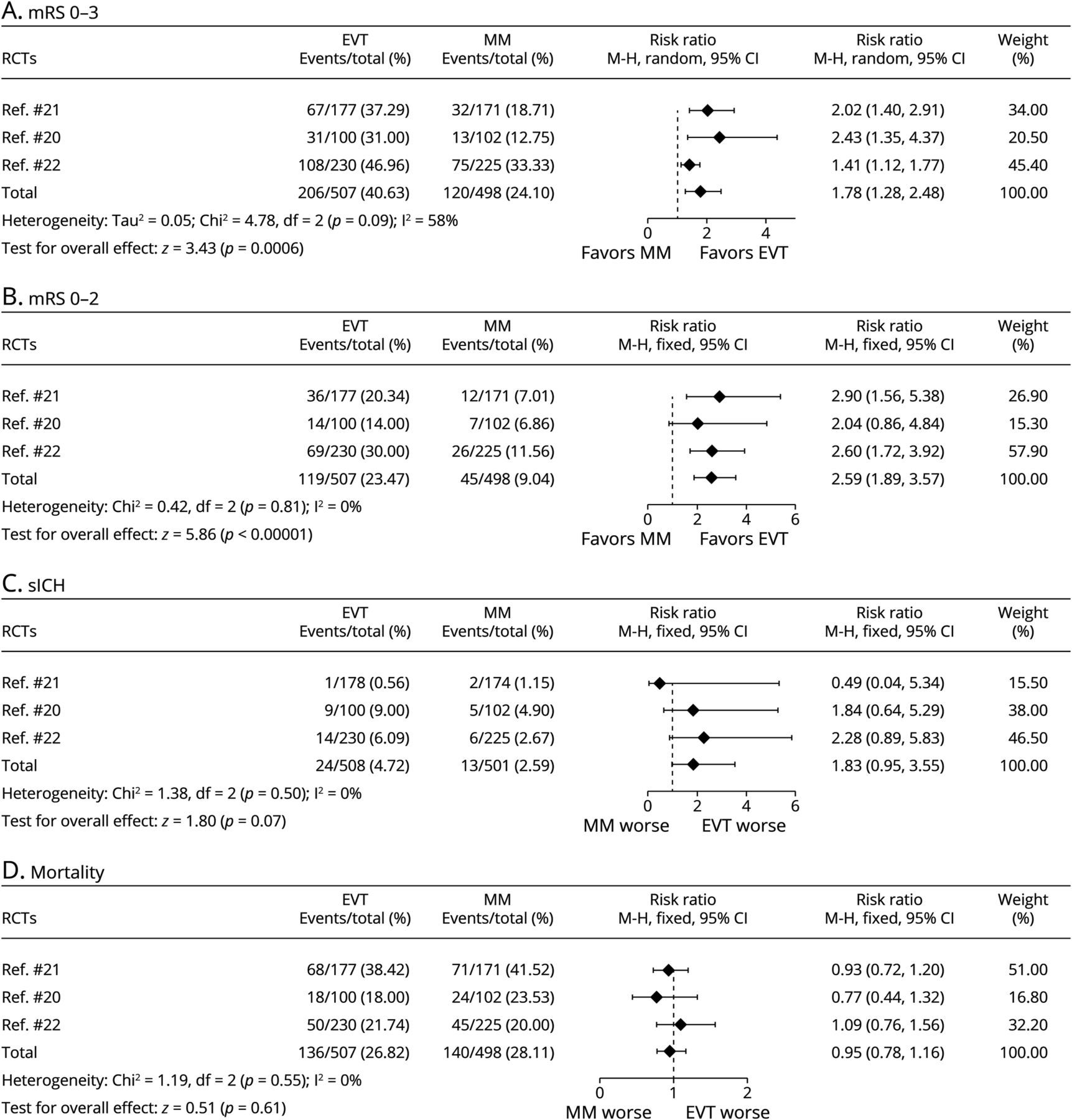 EVT =血管内血栓切除术;毫米=医疗管理;夫人=改良Rankin规模;个随机对照试验(随机对照试验;西奇=症状性颅内出血。